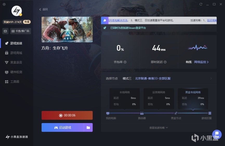 ②贴出在小黑盒加速器中加速《方舟:生存飞升》的截图(如下图)