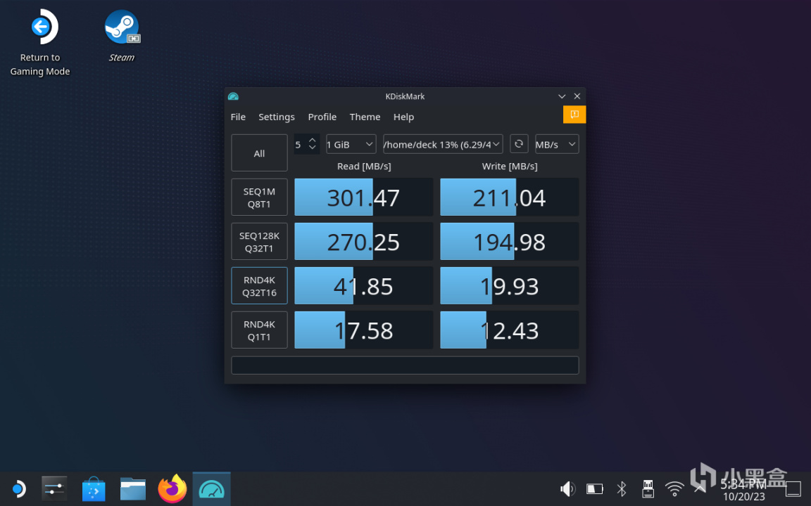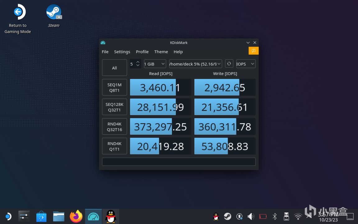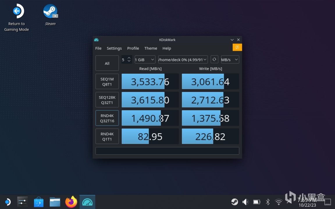 实际测试中,在STEAM DECK上能发挥的性能也是相当不错,虽说STEAM DECK所采用的是PCIe3.0通道,但也能发挥出SN770M的大部分性能,在硬盘测试软件中能把PCIe3.0的带宽跑满。