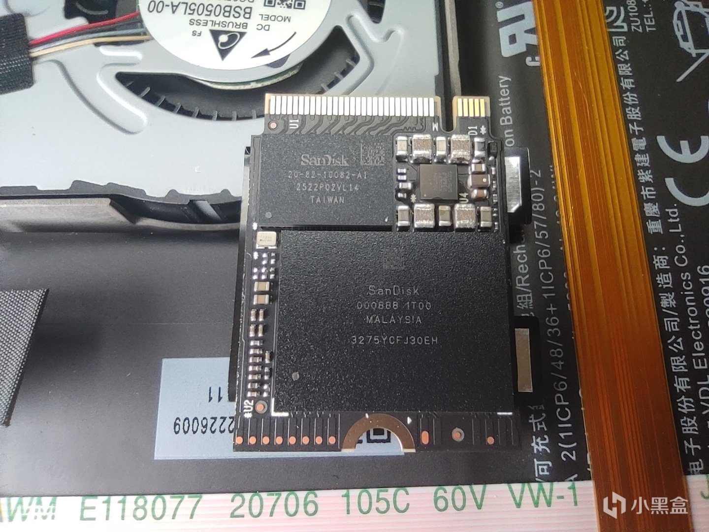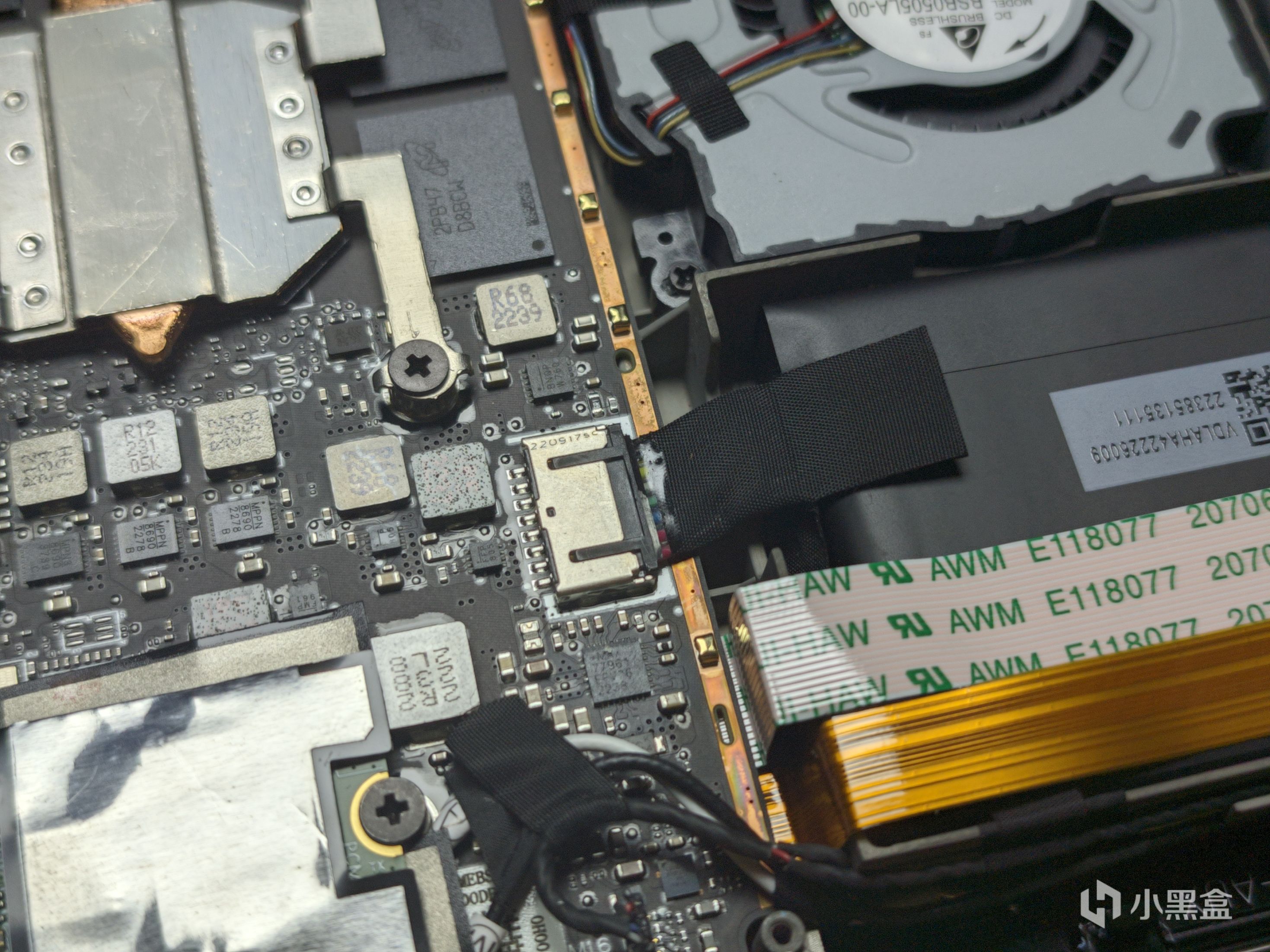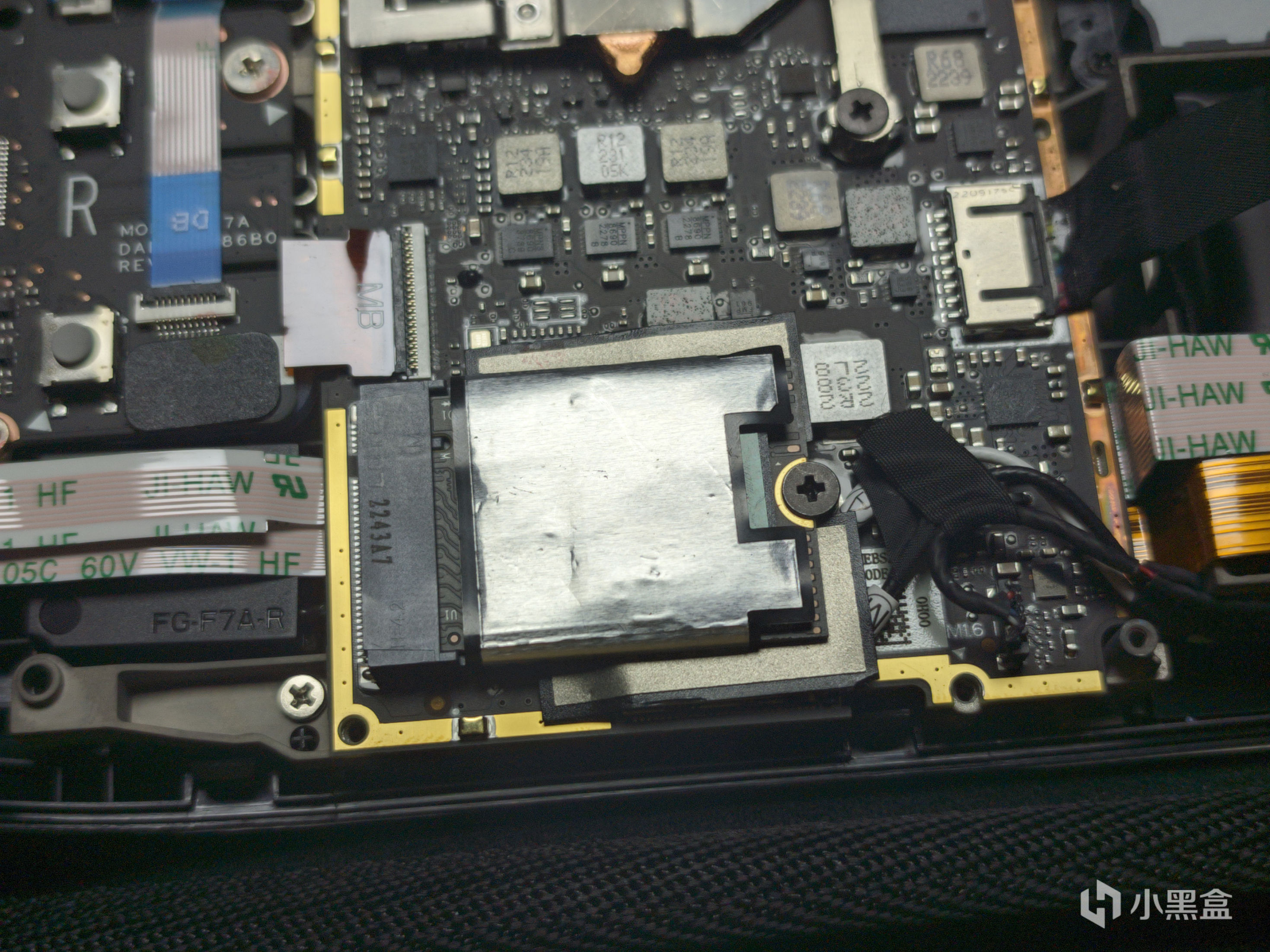 在拆下散热片后可以看到硬盘所在位置以及右侧的电源排线,有过加装笔记本硬盘的盒友应该都很清楚,在拆机后应该第一时间断开电源排线,第一步没有说则是因为排线被散热片给挡住了,那么在卸下散热片的第一时间,就是要将电源排线给断开,断开后可以适当按几下开关机键来确保没有余电,这一点应该都很清楚了。