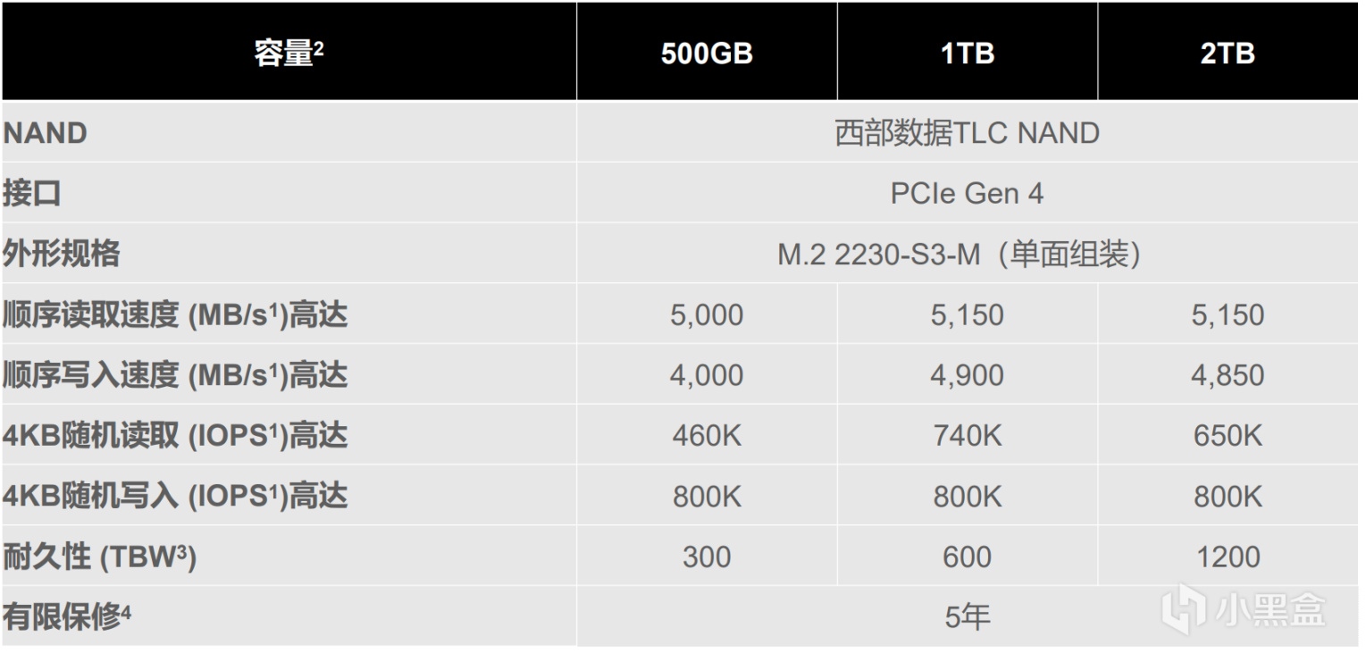 其次就是保修,在扩容之前我也着重考虑过这一点,在几个平台中都大致搜了一下,结果大部分都是OEM产品,如果坏了想走保修要花很大精力(并且很多都是店保)。而作为西部数据发布的一款消费级固态硬盘,整体享受5年质保或600TBW(随容量改变,详见下图),基本和目前大多数2280规格的固态硬盘一致了。