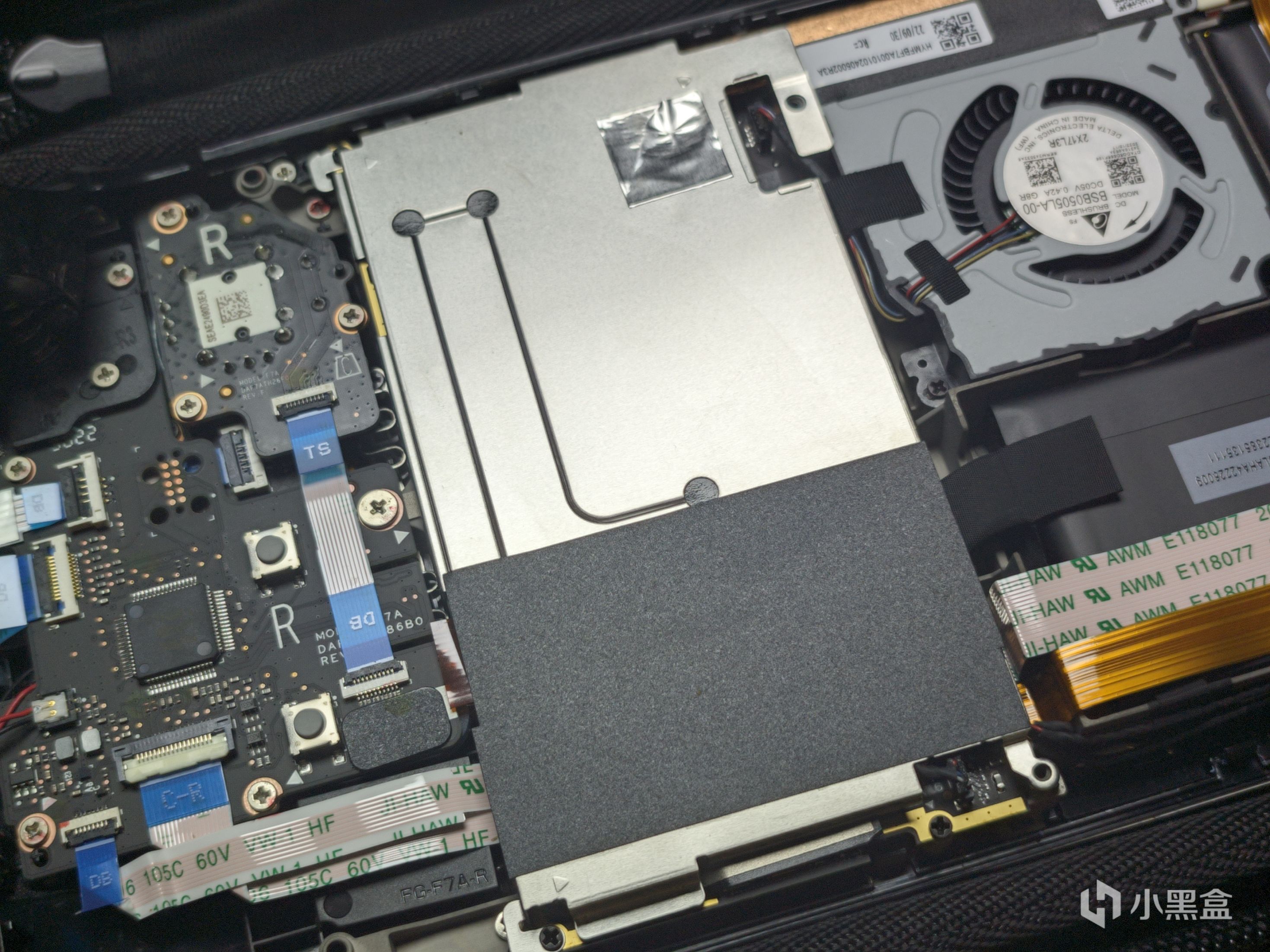 将后盖打开之后,换硬盘的主要就是在图片左边的这一块位置了,可以看到在风扇左边有很大的一块散热片,我们要做的就是将这一块散热片给拆下来。同样是使用螺丝刀进行拆卸,但要注意的是右上角的排线旁边有一块被贴住的部分,需要将它给撕下来,再将隐藏在其中的螺丝给拧掉。虽然说这里的防拆贴是为了在保修的时候判断有没有被私拆过,但我想买了STEAM DECK的应该都不会考虑保修,毕竟送到国外进行保修也是需要不少钱的。