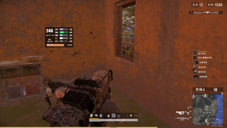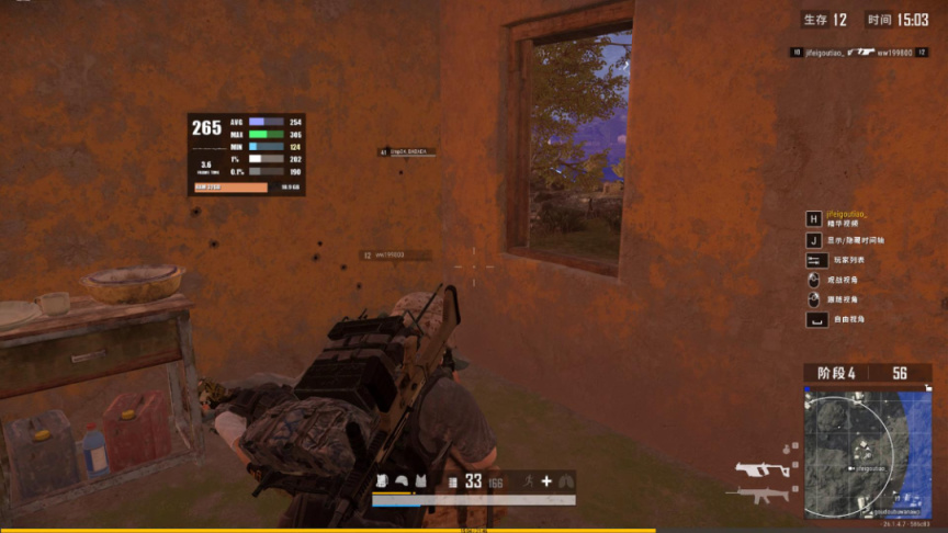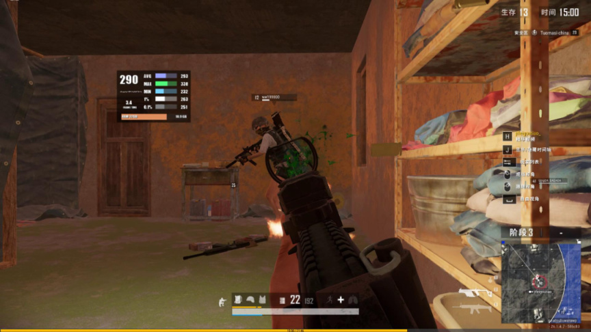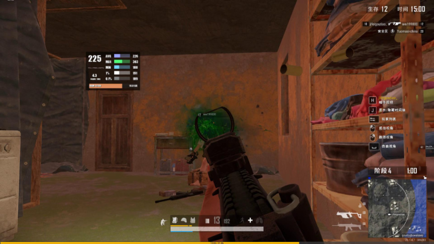 《PUBG 绝地求生》游戏中,三极致画质,渲染比例100%,图形API为DX11,4K分辨率下,游戏实际帧率为210FPS左右,大部分时间保持在240FPS以上;