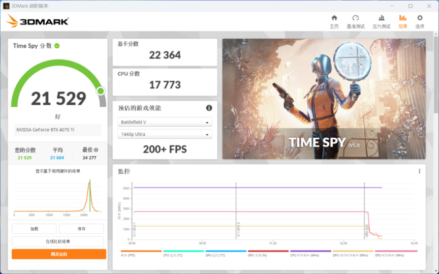 Time Spy显卡DX 12性能基准测试,显卡得分22364分,CPU得分17773分;