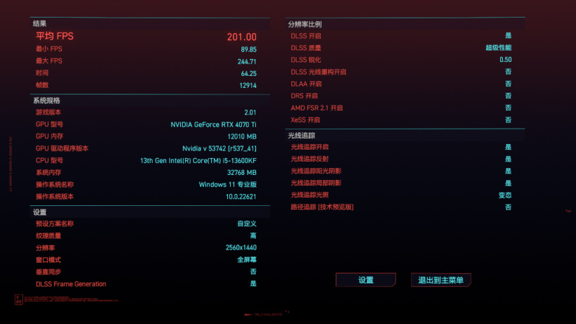 《赛博朋克2077》基准测试,画质超级,光追超级,DLSS设为超级性能模式,并开启DLSS 3.0,4K分辨率下,游戏平均帧率为119.02 FPS。2K分辨率下,游戏平均帧率为201 FPS;