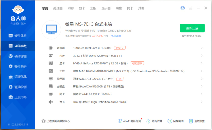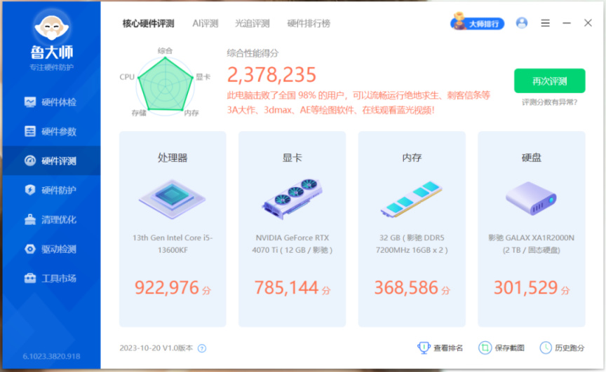 辛辛苦苦装完机,当然还得检验下实力。鲁大师整机测试得分237W分;