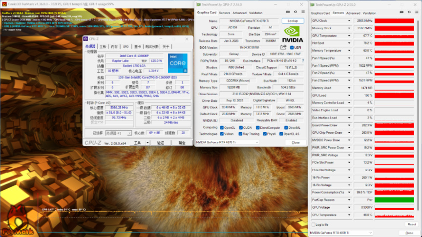 Furmark烤机测试,显卡温度68°左右,显卡功耗280W左右;