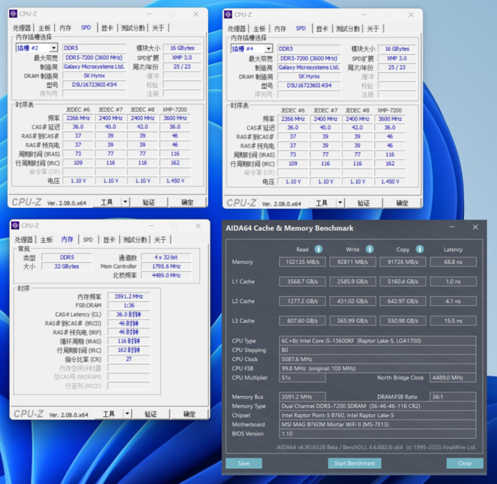 内存读写测试,直接开启XMP。内存读取速度为102135 MB/s,写入速度为92811 MB/s,复制速度为91726 MB/s,延时为68.8 ns;