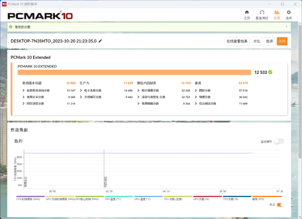 PC Mark Extended整机测试,整机得分12533分,常用基本功能得分10886分,生产力得分11699分,数为内容创作得分16169分,游戏得分32375分;