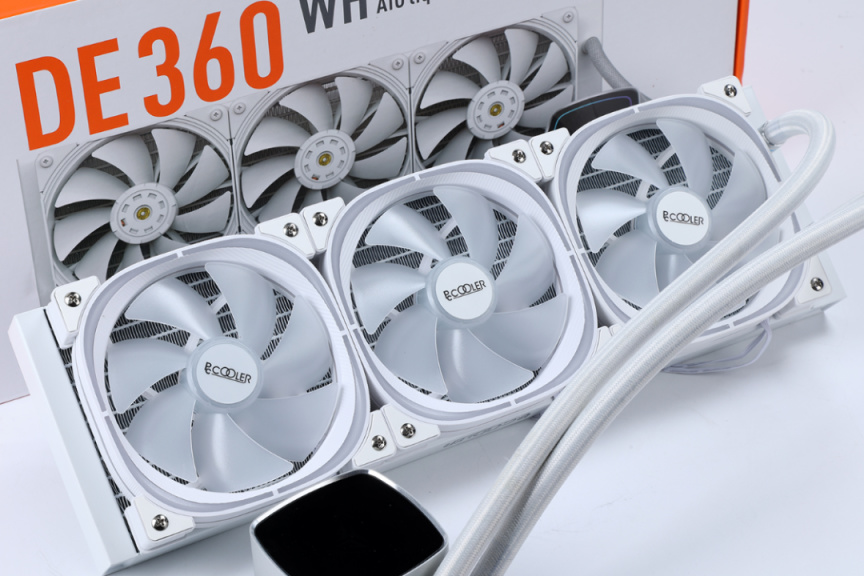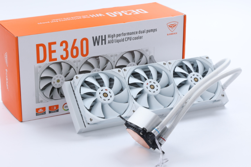 接着装散热。降压啥的咱也不屑于去做,直接规格拉满,选择了这款同样来自超频三的DE-360 WH 白色一体式水冷,实测300W的139K都能压得住,用来搞定13600KF当然也不在话下。水冷本体采用全白配色,风扇无灯,镜面玻璃冷头盖搭配铝合金材质冷头外壳,质感表现优秀,同时还有ARGB灯效加持。