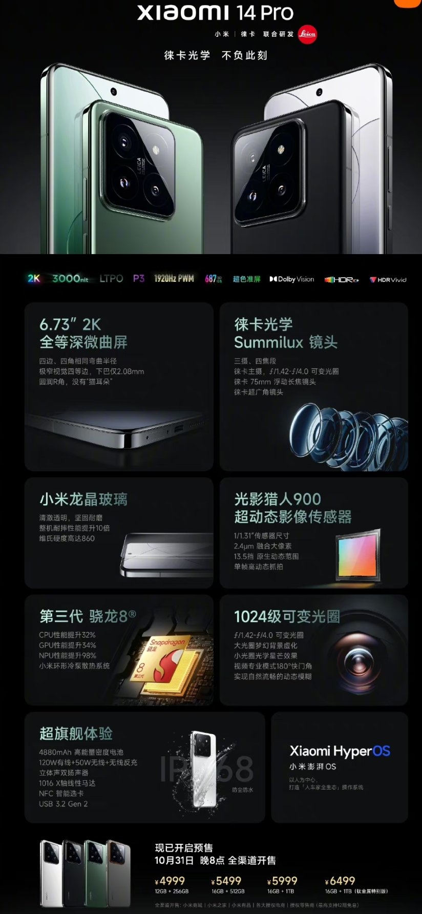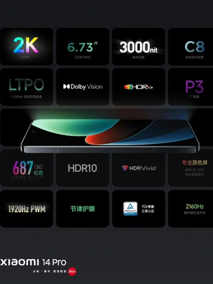 6.73″ 2K超視感屏,522PPI,C8發光材料,3000nit峯值亮度,1-120Hz自適應刷新率,DC 調光,全新小米龍晶玻璃。