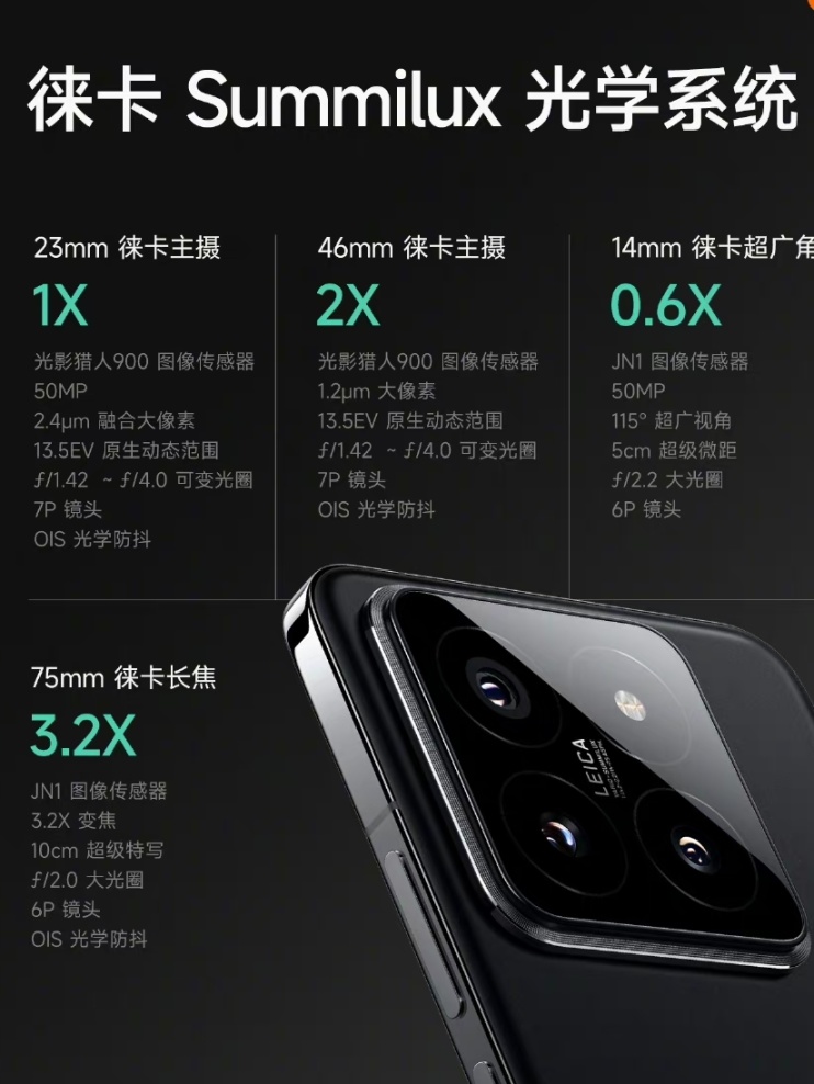 影像傳感器 光影獵人1/1.31″定製大底,13.5EV原聲超高動態範圍,搭配徠卡光學Summilux鏡頭,感光量提升180%。23mm 5000萬像素徠卡主攝,75mm徠卡浮動長焦,14mm 5000萬像素徠卡115°超廣角。