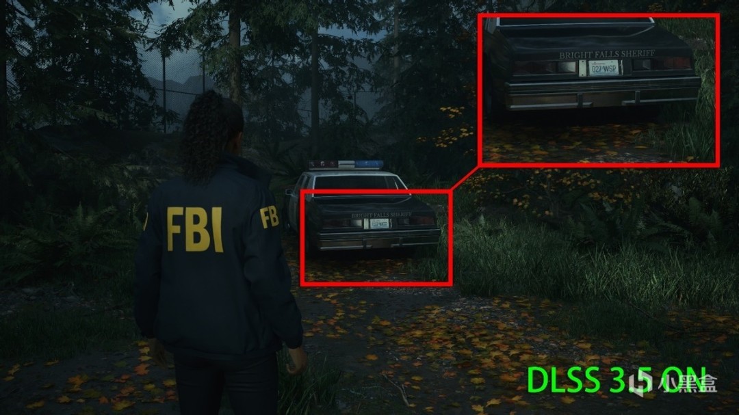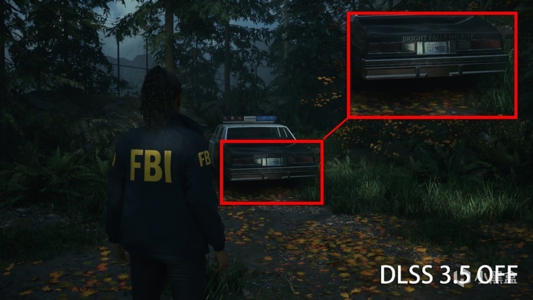 在第一章节的丛林中同样也能很好感受到DLSS 3.5带来的效果,远处的车牌和Logo更为清晰可见,草地上的光斑也更为自然。一旦关闭DLSS 3.5,车牌和Logo开始变得模糊,草地的光斑变成了提前设置好的路灯。