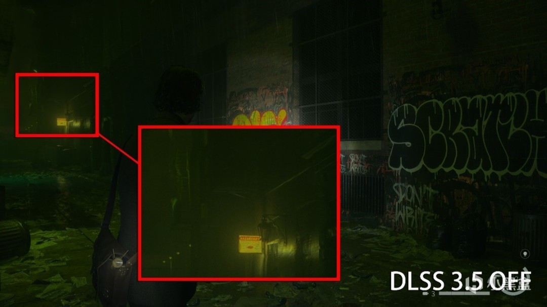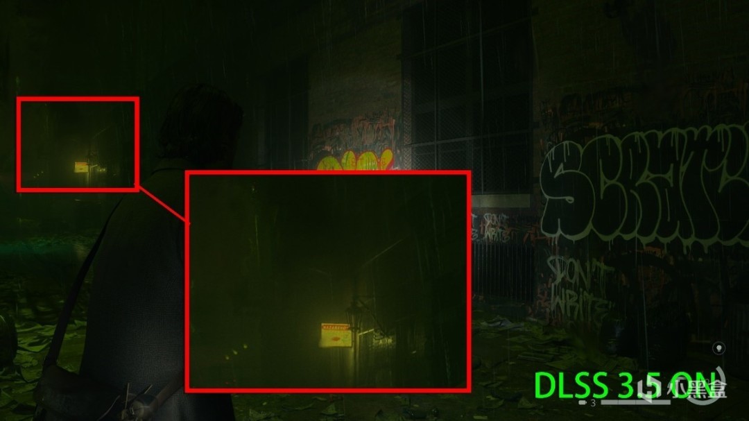 夜晚远处路灯照明也是很好的体现,如果关闭DLSS 3.5,灯光效果就会变得模糊且在墙面上无差别的反射,让雨天墙壁的质感大打折扣。而在实际游戏体验中,体验过DLSS 3.5画质后,一旦关闭总觉得画面变得有点像油画了。