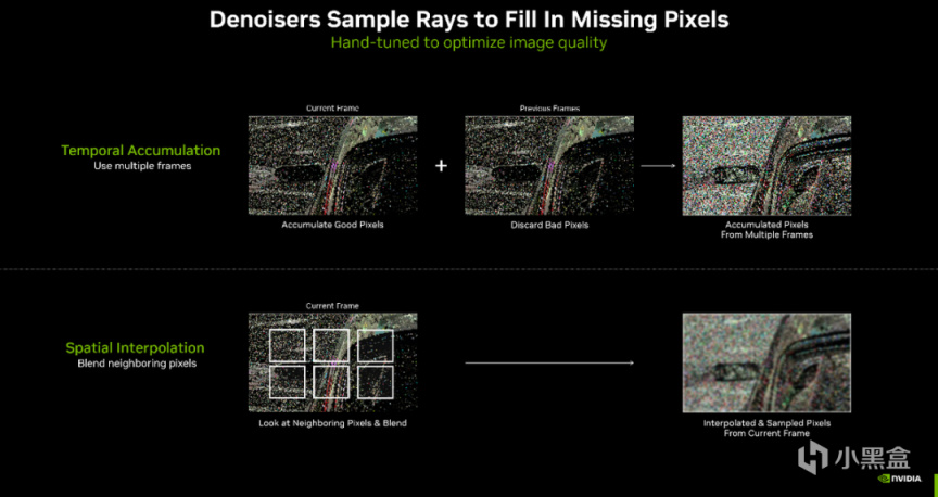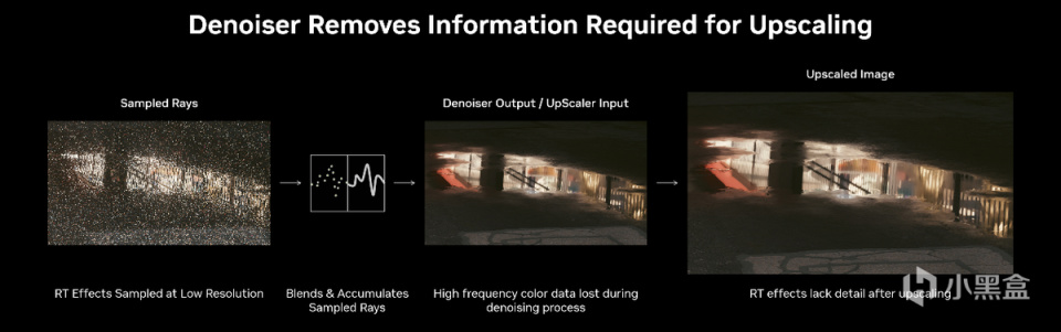因此现在常规的光线追踪做法就是通过光线采样,在各个场景中采集少量的光线,作为场景照明、反射率、阴影表现的样本。由于采样率不多,画面中的光线表达不准确、噪点、离奇光线实际上是无法避免的。因此在完成一帧游戏画面渲染之后,还需要额外的进行降噪计算来弥补光线追踪采样率过少所带来的画质损失。