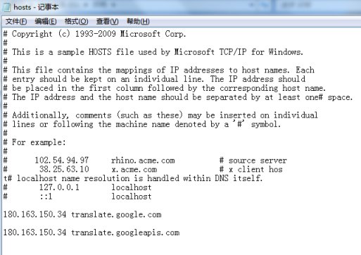 並把【180.163.150.34 translate.google.com】【180.163.150.34 translate.googleapis.com】(IP 和地址之間有一個空格)加到下方空白處,接着再把修改後的 hosts 文件拖回原地,命令提示符輸入【ipconfig /flushdns】清除 DNS 緩存後重啓瀏覽器就行了。這裏我之所以沒有輸入【translate.google.cn】是因爲【.cn】後綴的這個加入 hosts 後無效,需要輸入【.com】後綴的,如果你們輸入【.cn】後綴的地址無效可以換成【.com】後綴試試。