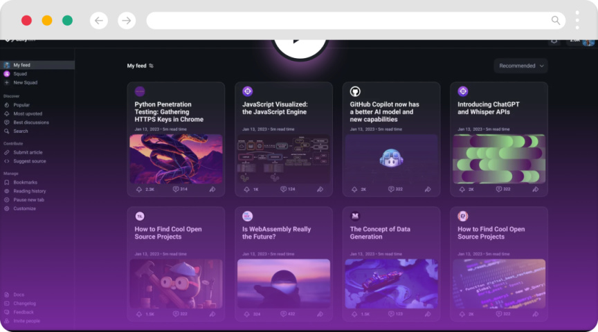daily.dev 是一個非常強大,質量精良的編程內容訂閱社區,提供了超過 350+ 個開發者資訊來源,彙總了 1 萬多個技術標籤,是個獲取最新開發資訊的好渠道。提供瀏覽器插件。