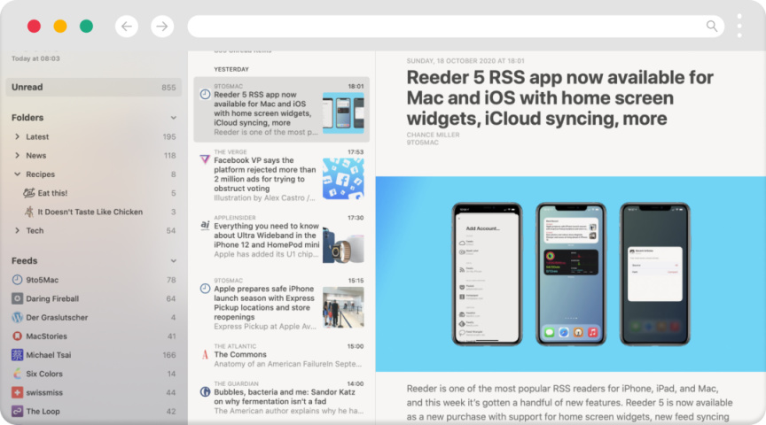 Reeder可以說是iOS 與macOS 上最好用的RSS 閱讀器之一;其支持與 Feedbin、Feedly、NewsBlur、The Old Reader、Inoreader、FreshRSS、Pocket、Instapaper 等衆多雲服務同步。
