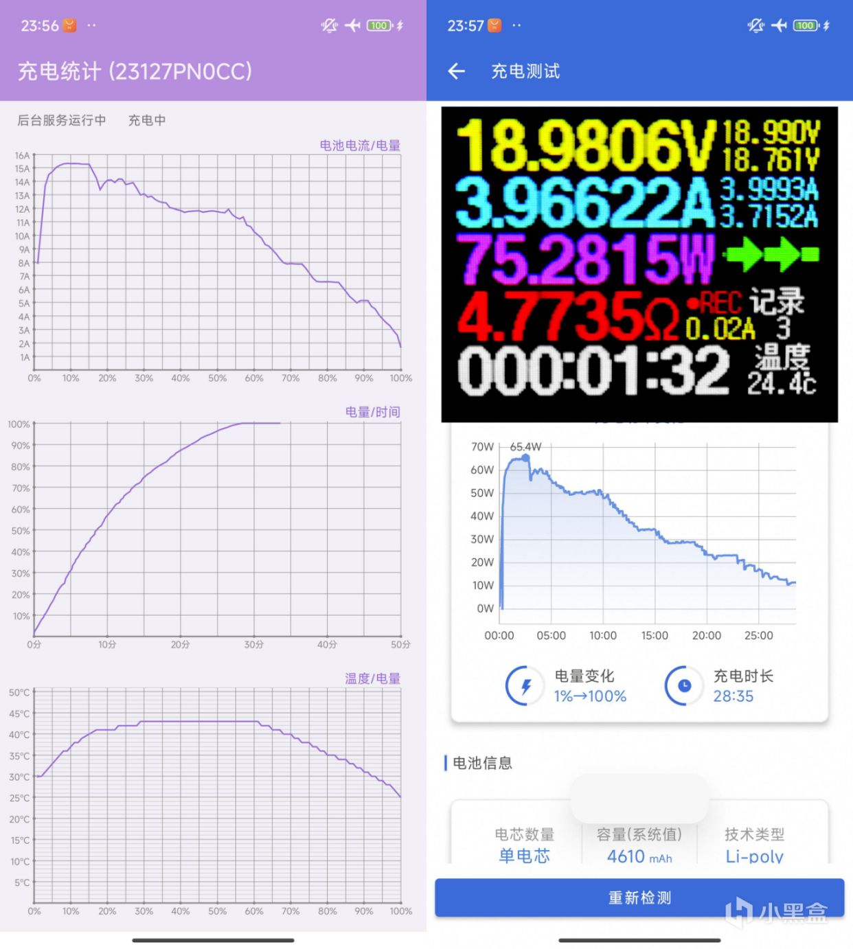 实测从1%到100%用时约28分钟35秒,前几分钟峰值功率跑到了约75.2W。