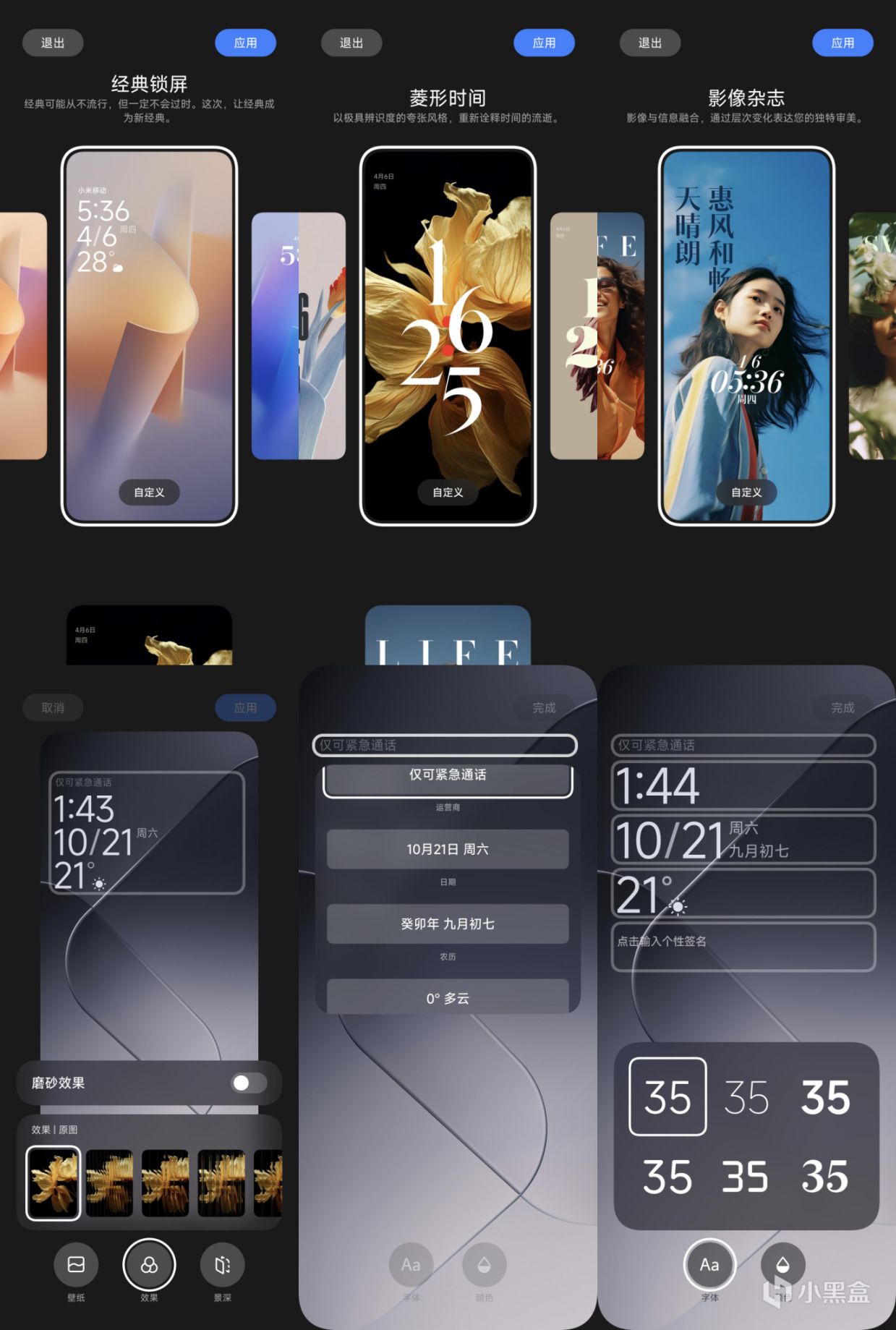 然后就是这个新的锁屏界面了,乍一看相比MIUI变化不大,当你长按锁屏,便会出现全新的个性化自定义编辑界面。
