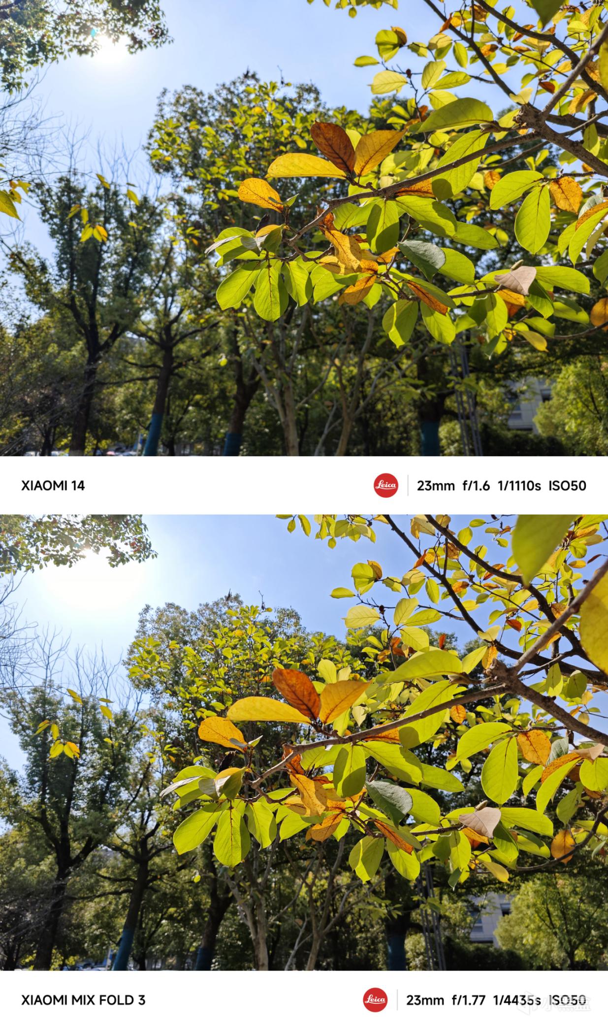 大光圈镜头带来了更柔美的背景虚化效果,对比一下f/1.77的小米MIX Fold 3,小米14拍出的树叶前景与后面的背景区隔更加明显,也更有相机质感。