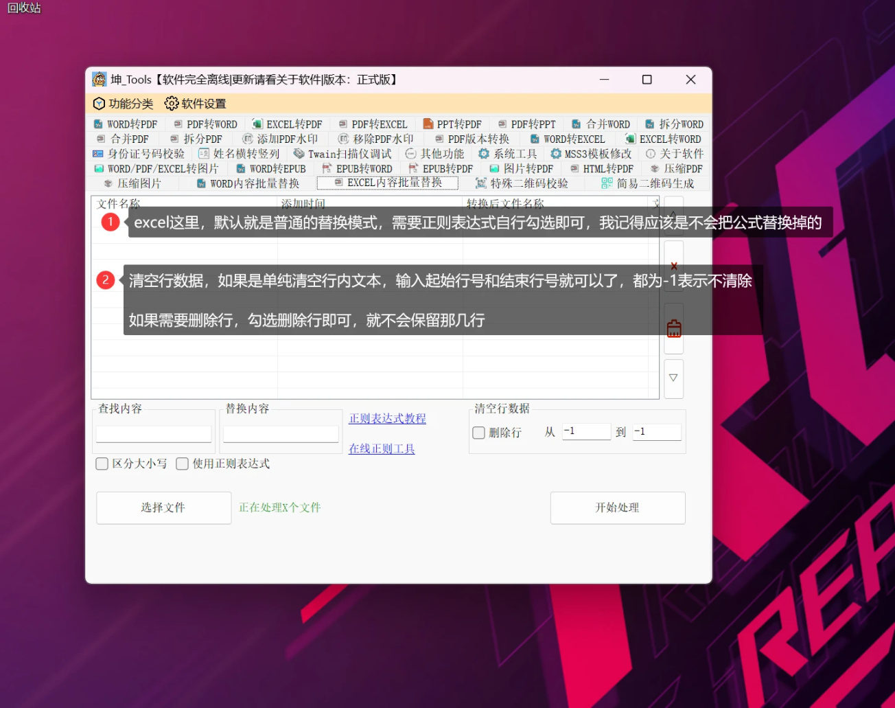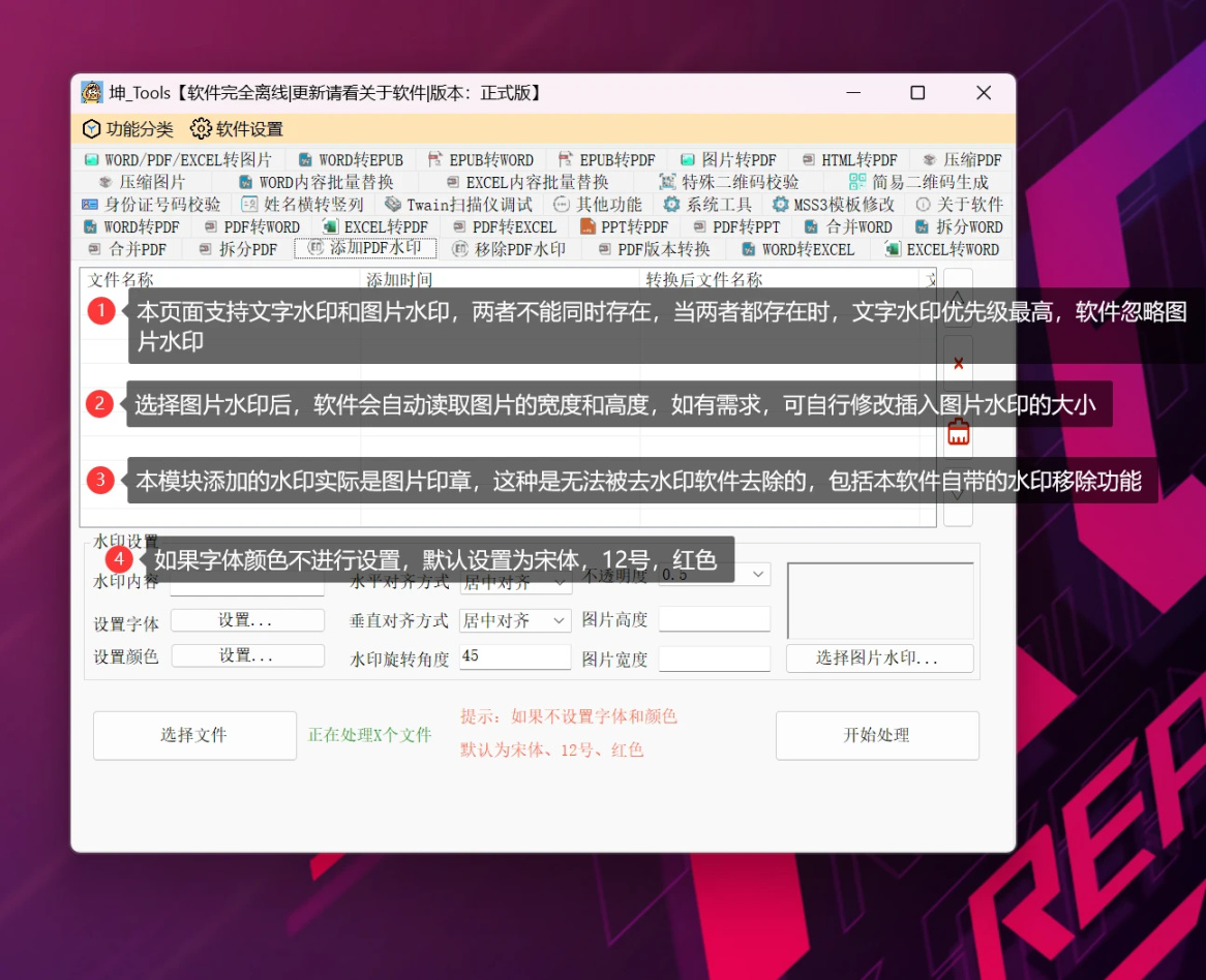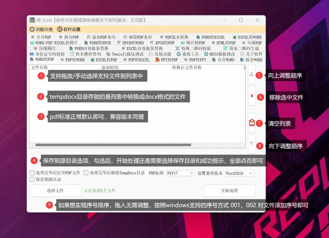 由于软件功能较多,且大多数关于文档转换的模块操作都类似,没有特殊参数的模块将不进行介绍;如果有些没提到的,就是功能比较简单,或者是作者本人才会用到的针对性功能,大家忽略即可;文件列表中,选中文件后右键可打开右键菜单