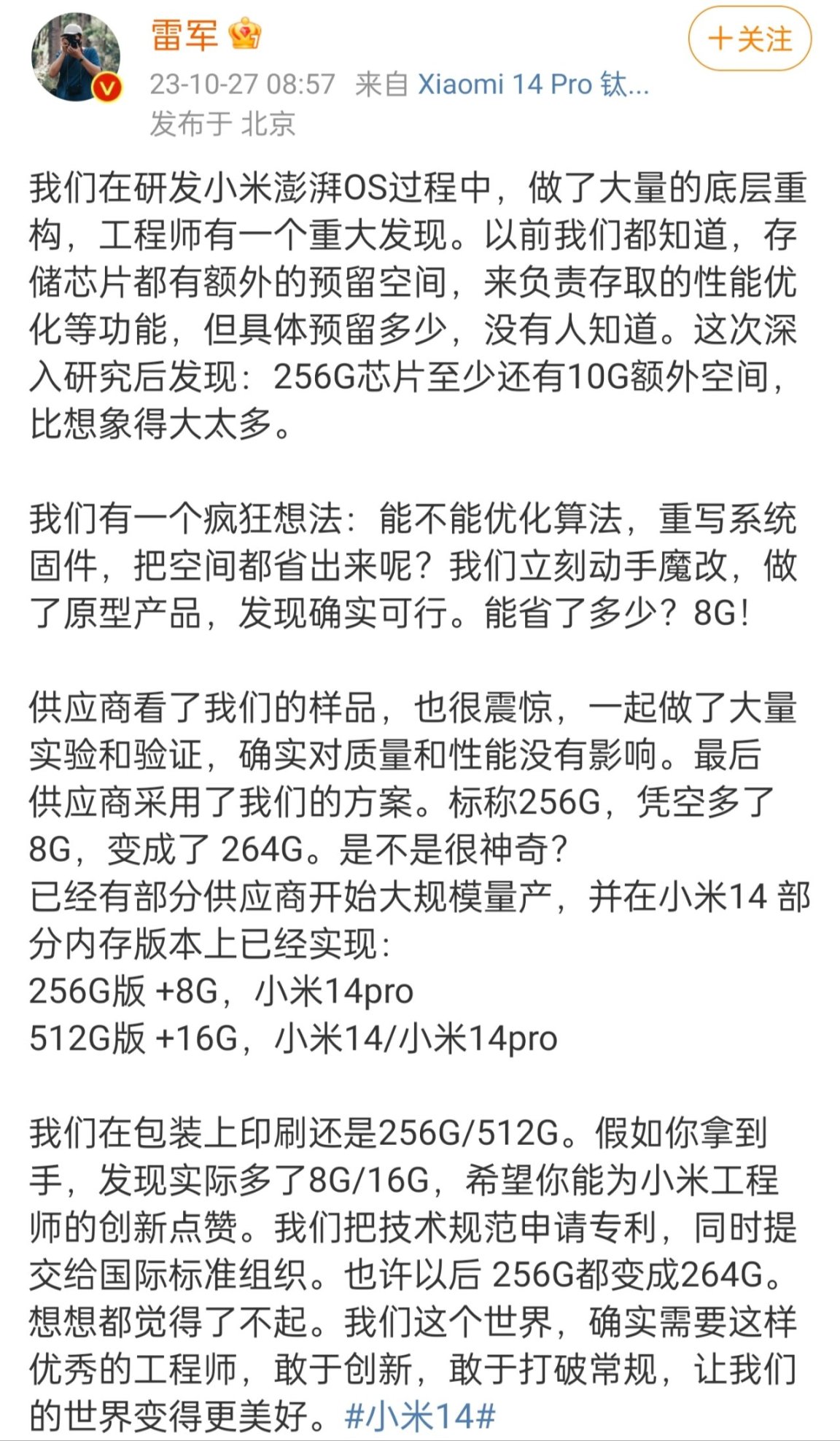 此外,雷總還在微博上發文表示:我們在包裝上印刷還是256G/512G。假如你拿到手,發現實際多了8G/16G,希望你能爲小米工程師的創新點贊。我們把技術規範申請專利,同時提交給國際標準組織。也許以後 256G都變成264G。想想都覺得了不起。我們這個世界,確實需要這樣優秀的工程師,敢於創新,敢於打破常規,讓我們的世界變得更美好。