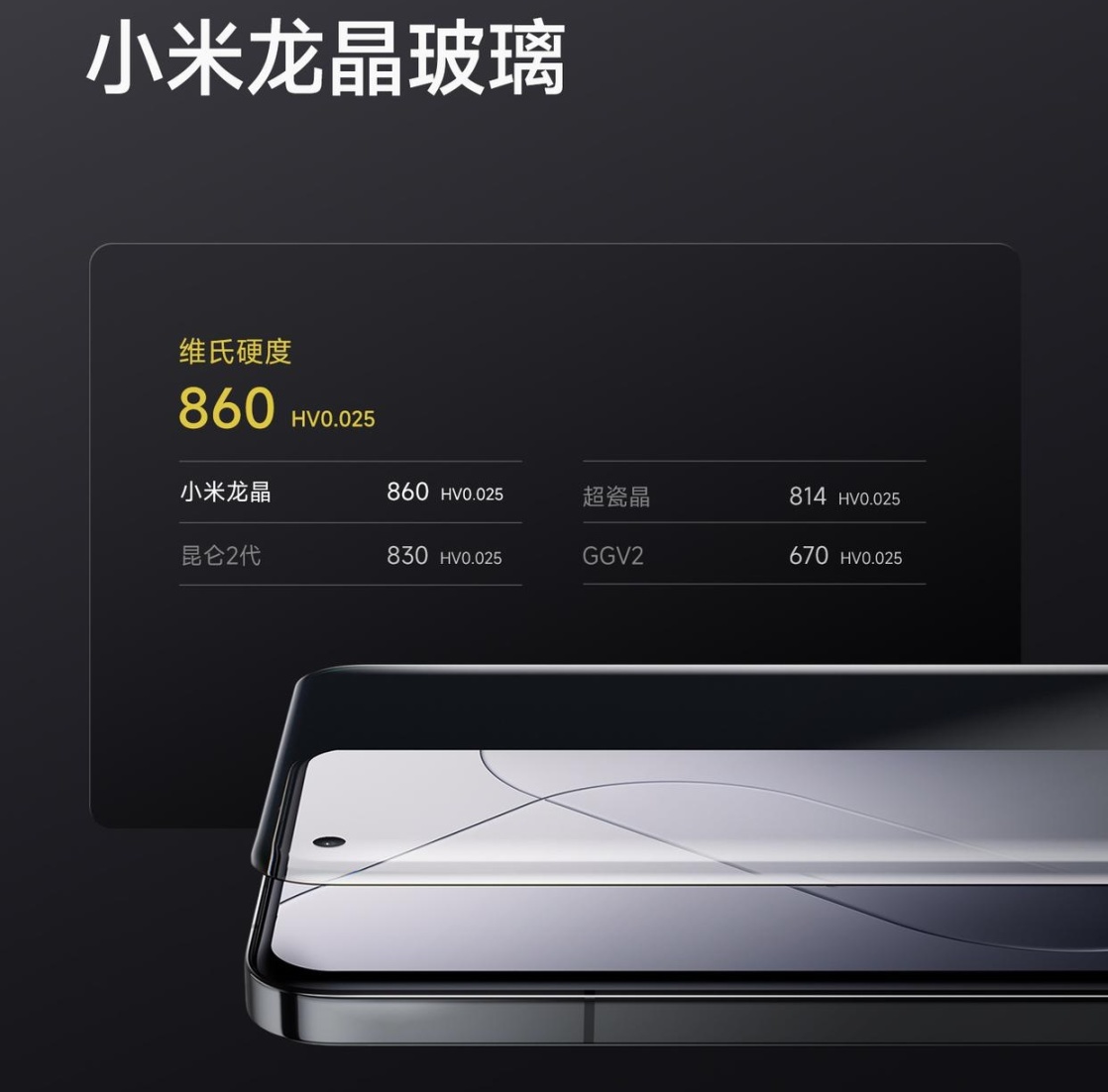 同时,雷军还表示,龙晶玻璃维氏硬度达到了860 HV0.025,而最近发售的苹果15系列的玻璃硬度仅为814 HV0.025,华为Mate 60系列上的昆仑二代玻璃为830HV0.025,所以从数据来看,小米14pro的屏幕硬度明显高于前两者!
