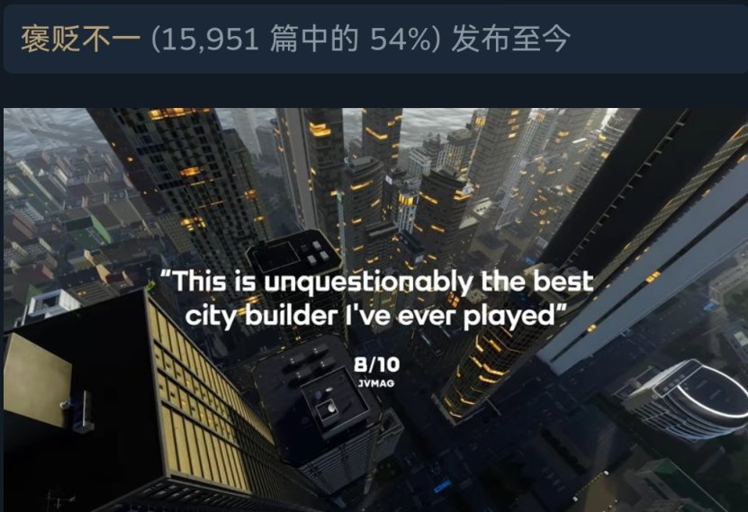 目前steam平台收录了15951条关于《城市:天际线2》的评论,游戏评价为褒贬不一,好评率仅为54%!