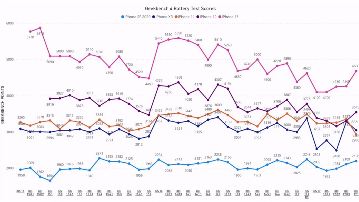 根据 YouTube 频道 iAppleBytes 进行的续航测试,iPhone 13、iPhone12 以及 2020 款iPhone SE在升级 iOS 17.1 正式版之后,续航能力均有提升,其中 iPhone 13 续航(4680 分)比此前 iOS 17(4100 分)增长 14%,涨幅最大。