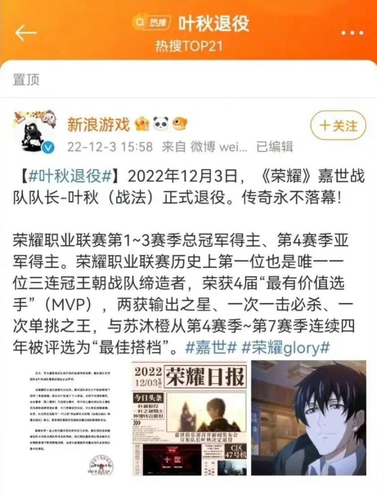 嘉世电子竞技俱乐部官方宣布:前战队队长、《荣耀》职业选手叶秋于当日正式退役,并表示:人生有梦,各自精彩。