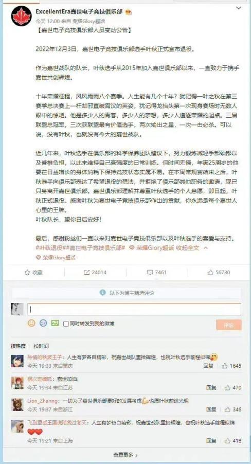 叶秋作为《荣耀》知名全职业选手,目前是第一个也是唯一一个曾连续获得三年冠军的选手。今年已经是叶秋效力于嘉世俱乐部的第七个年头,尽管有人质疑他已英雄迟暮,但如此匆忙地结束他的职业生涯,很显然是粉丝所无法接受的。