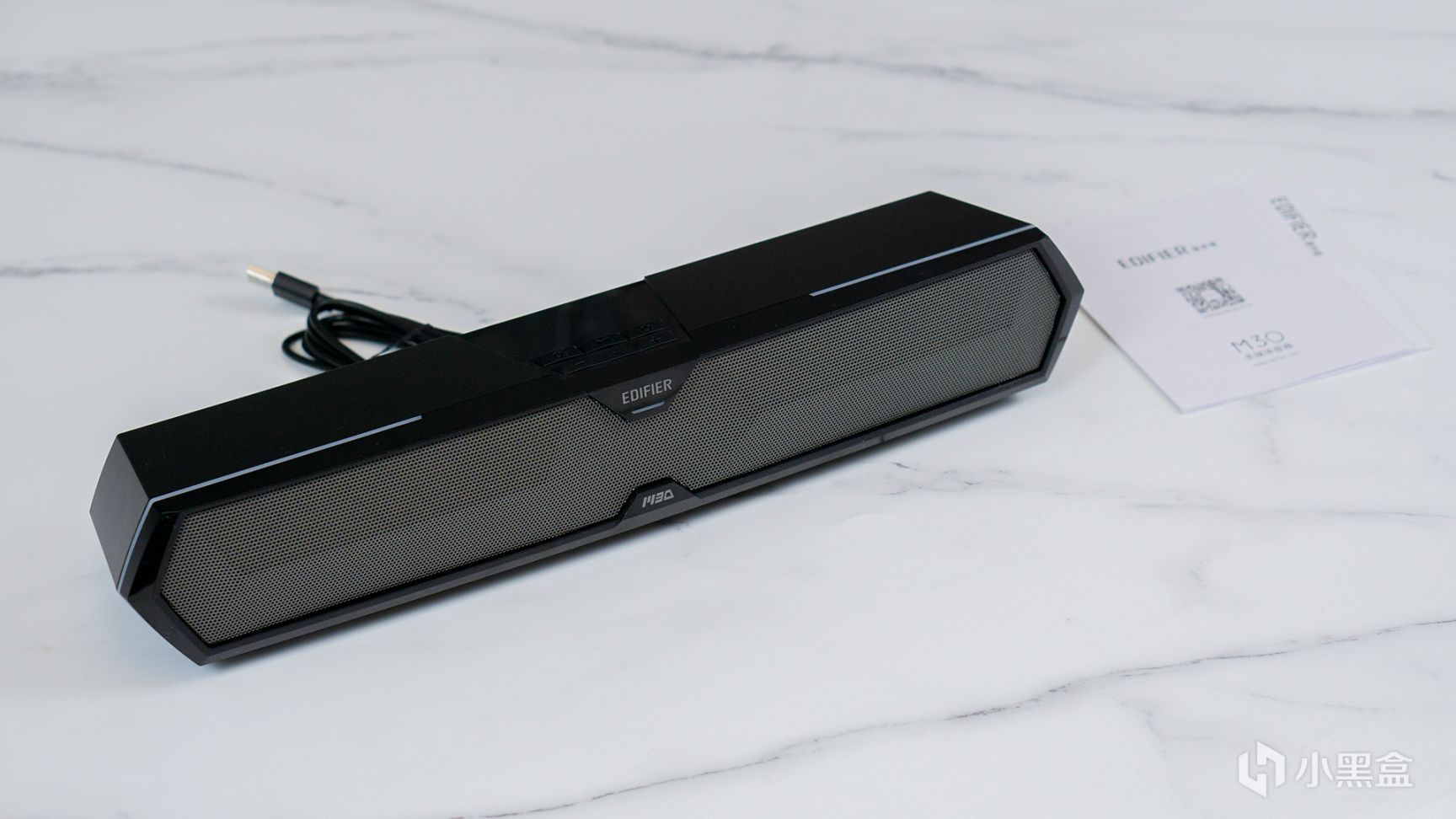 打开包装,我们就可以看到漫步者M30的本体及说明书。正面看,M30采用了长六角形的设计,有种赛博朋克的味道。