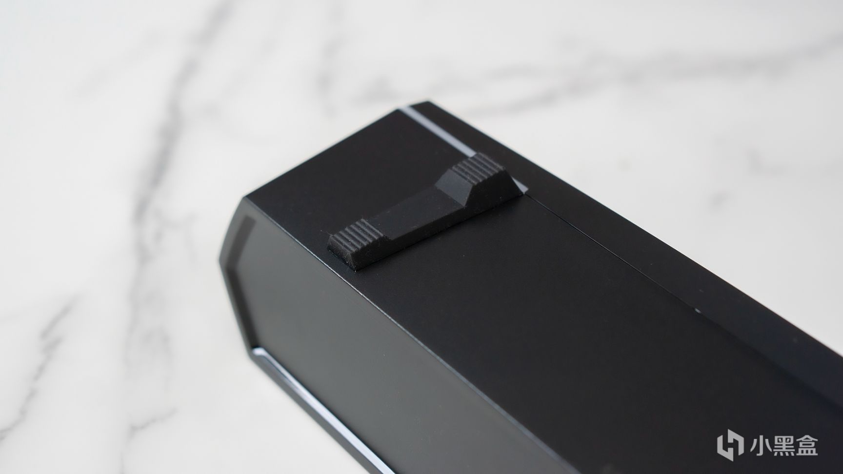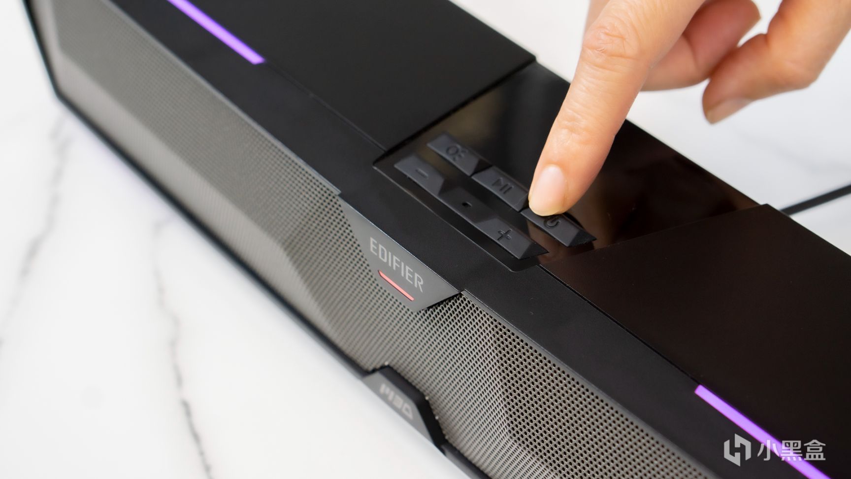 它的顶部为亮黑设计,集中了灯光、播放暂停、开关机、音量加减键及隐藏式麦克风,
