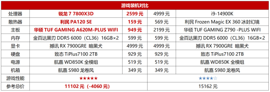 此外,在装机成本方面锐龙7 7800X3D的优势也非常明显,光是处理器就相对i9-14900K有2400元的优势,再加上它对主板与散热器的要求也很亲民,总体的装机预算就可以进一步降低。从装机配置的对比可以看到,锐龙7 7800X3D整机价格相对i9-14900K整机有高达4060元的优势,而游戏性能反而更高,性价比可以说是完胜了。