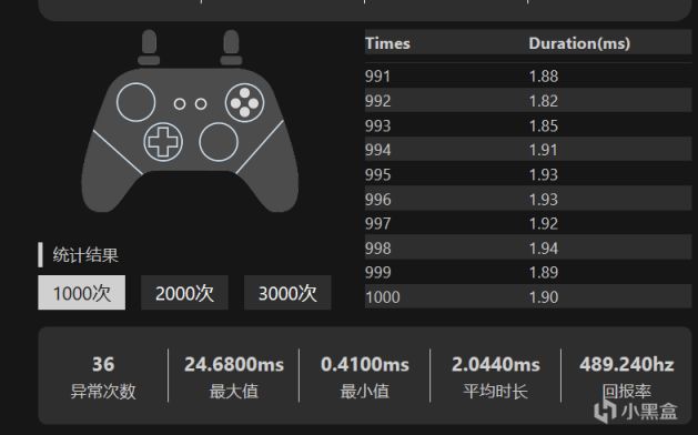 奕狐炫彩手柄采用了全方位调教的霍尔摇杆,终生不漂移,这里测试了一下有线连接PC状态下摇杆回报率大概在400hz到500hz之间,接收器连接PC状态下摇杆回报率大概在140HZ到160hz左右,可自行切换双摇杆无死区模式,当然关机不记忆此功能。