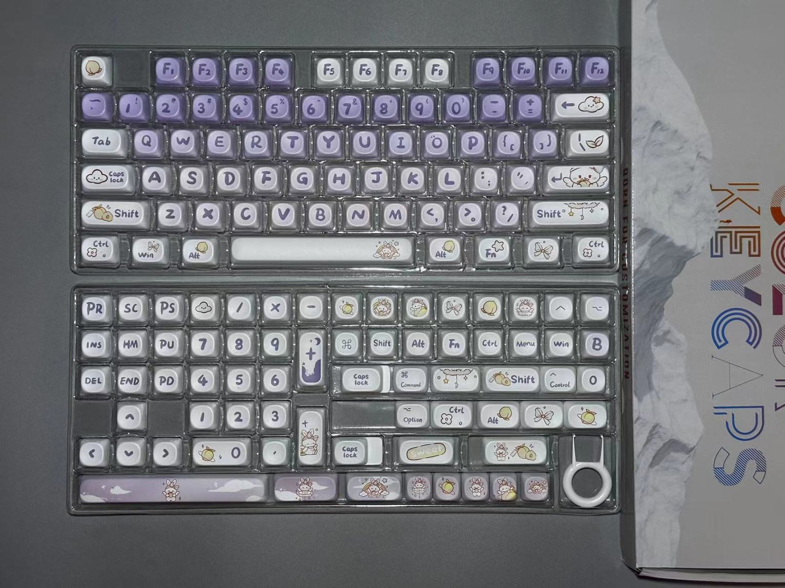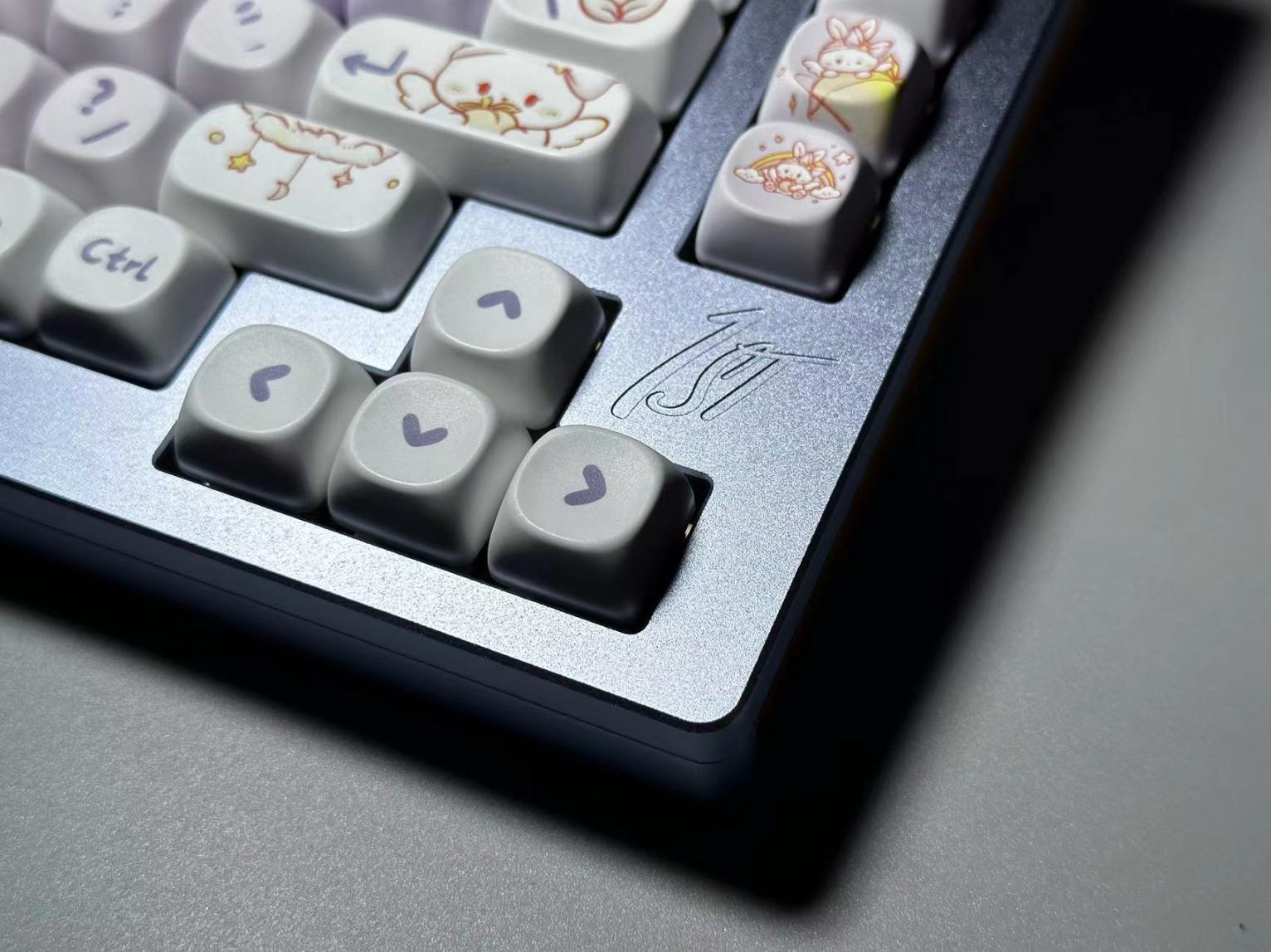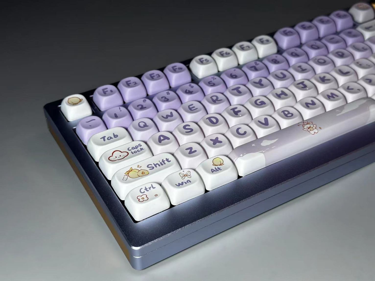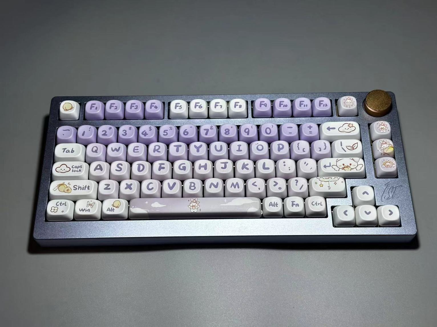 因为键盘这淡淡紫色是真没一套好配的键帽。然后就去TB找一圈,发现丘天外设有一套渐变紫兔,还挺可爱的和键盘也挺搭配。还是MOA高度PBT材质价格还比较便宜,于是就拿下了。