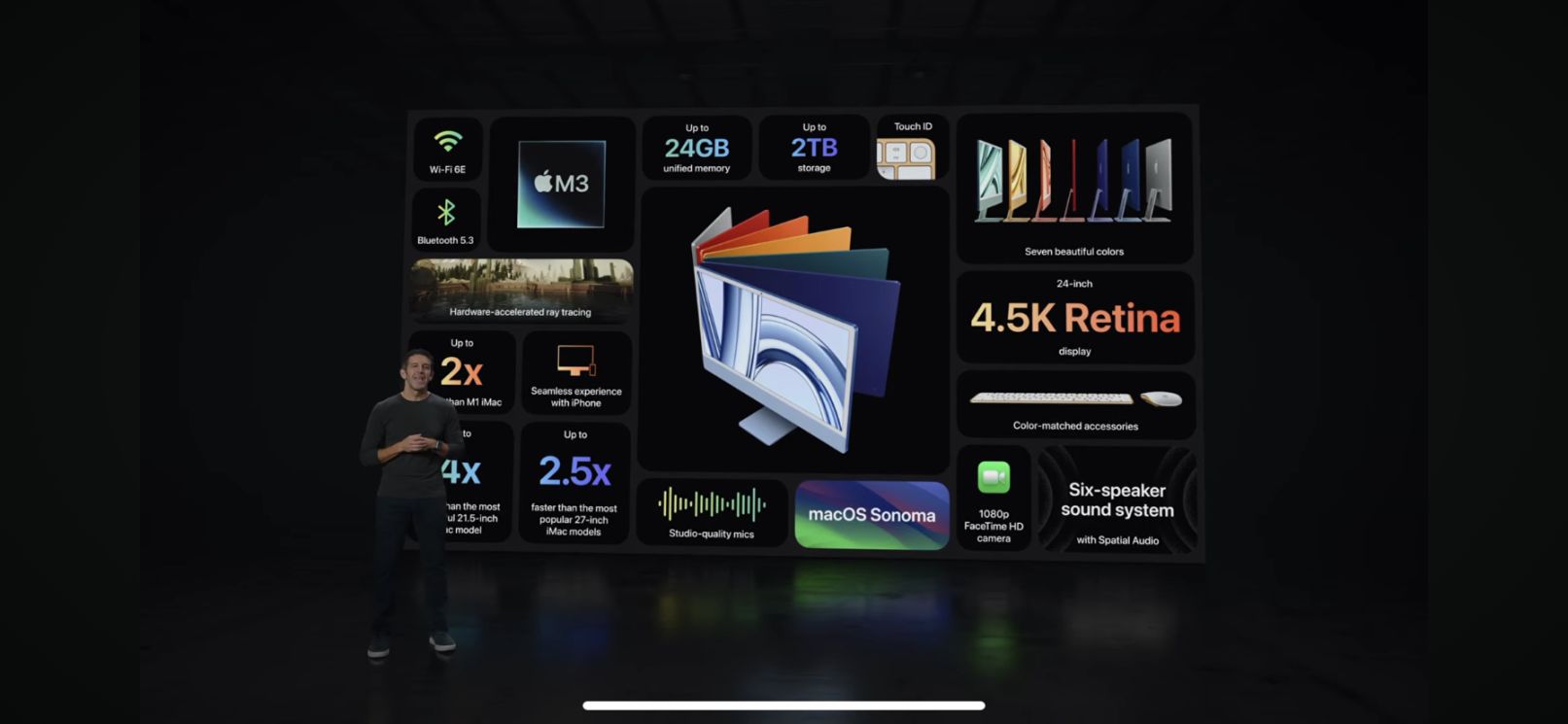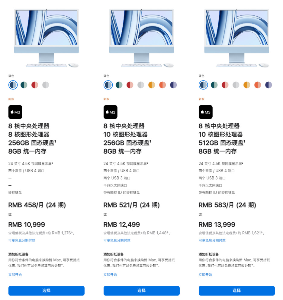 iMac系列產品全系標配M3,8G+256G起步價爲10999元,10999元系列產品無以太網端口