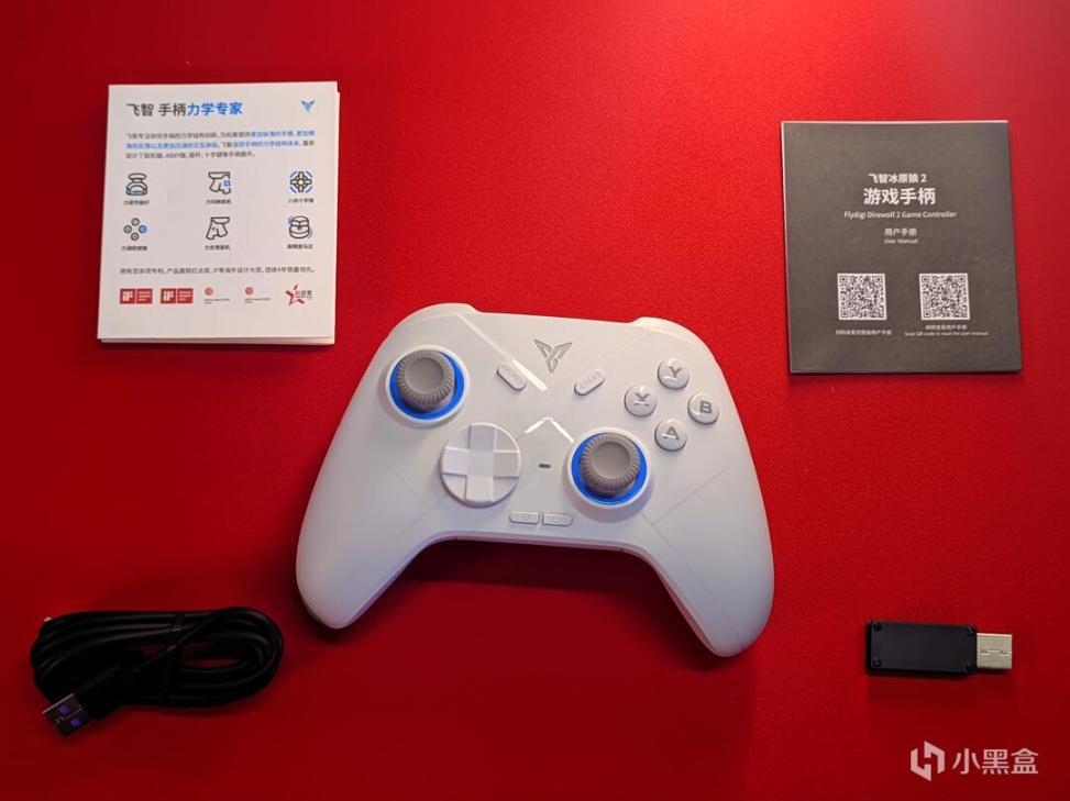 全部拿出之后,手柄的所有部分就在这里了,说明书,宣传册,数据线以及接收器,值得一提的是,宣传彩页上面的冰原狼部分已经换成了冰原狼2,倒也算是非常快的速度了,但~你确定买了狼2的哥们会再买一个吗?相比于狼1的各种将就,简直就像是赶工出来的产品一样,狼2的质感要好太多了。虽然样子长的和1代几乎有没有用,打眼一看也就是摇杆底部的装饰色从冰蓝色变成了深蓝色,剩下的简直就是一模一样,但其实你看上面就可以发现,相比较与1代的大众脸,2代重新开模后的顶部显得更加好看了,质感上有着不错的提升,同时对于按键部分,虽然还是有些许发硬,但相比较于1代,要舒服上了不少,对于握把的部分也进行了一些改动,这些都能看出厂商的用心程度。