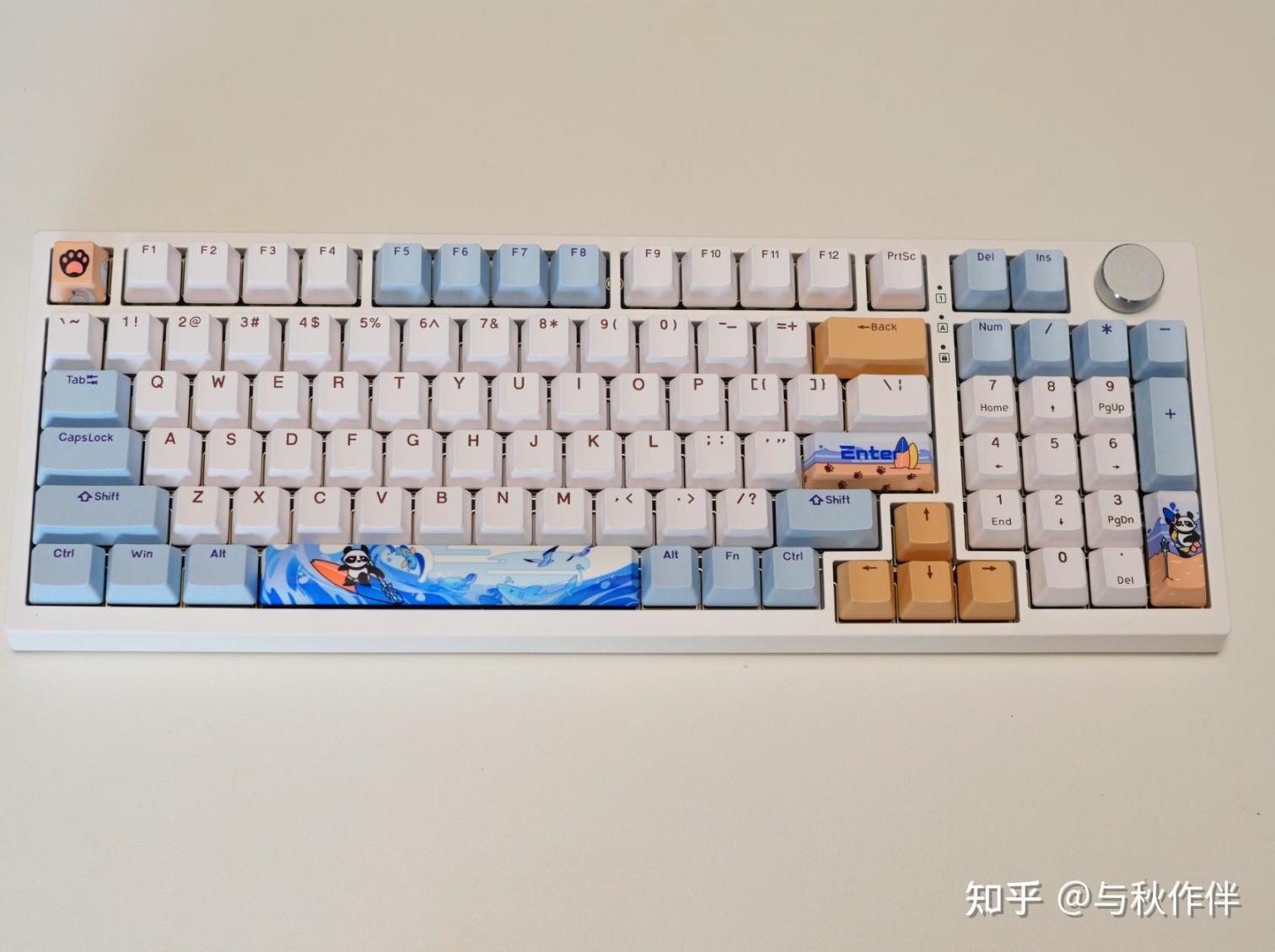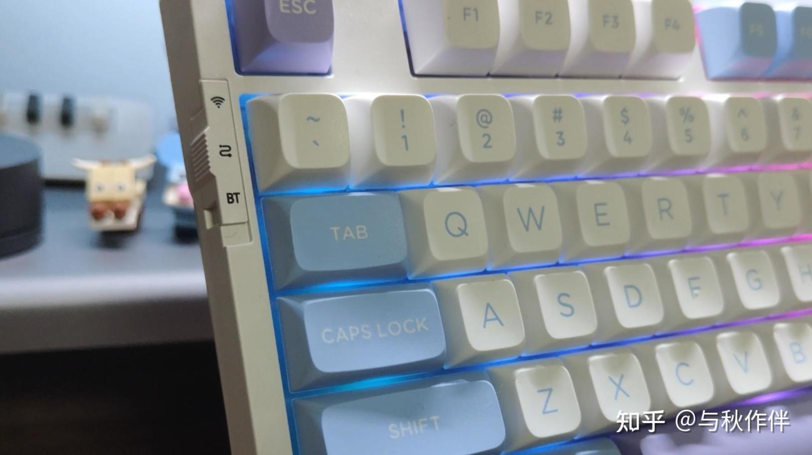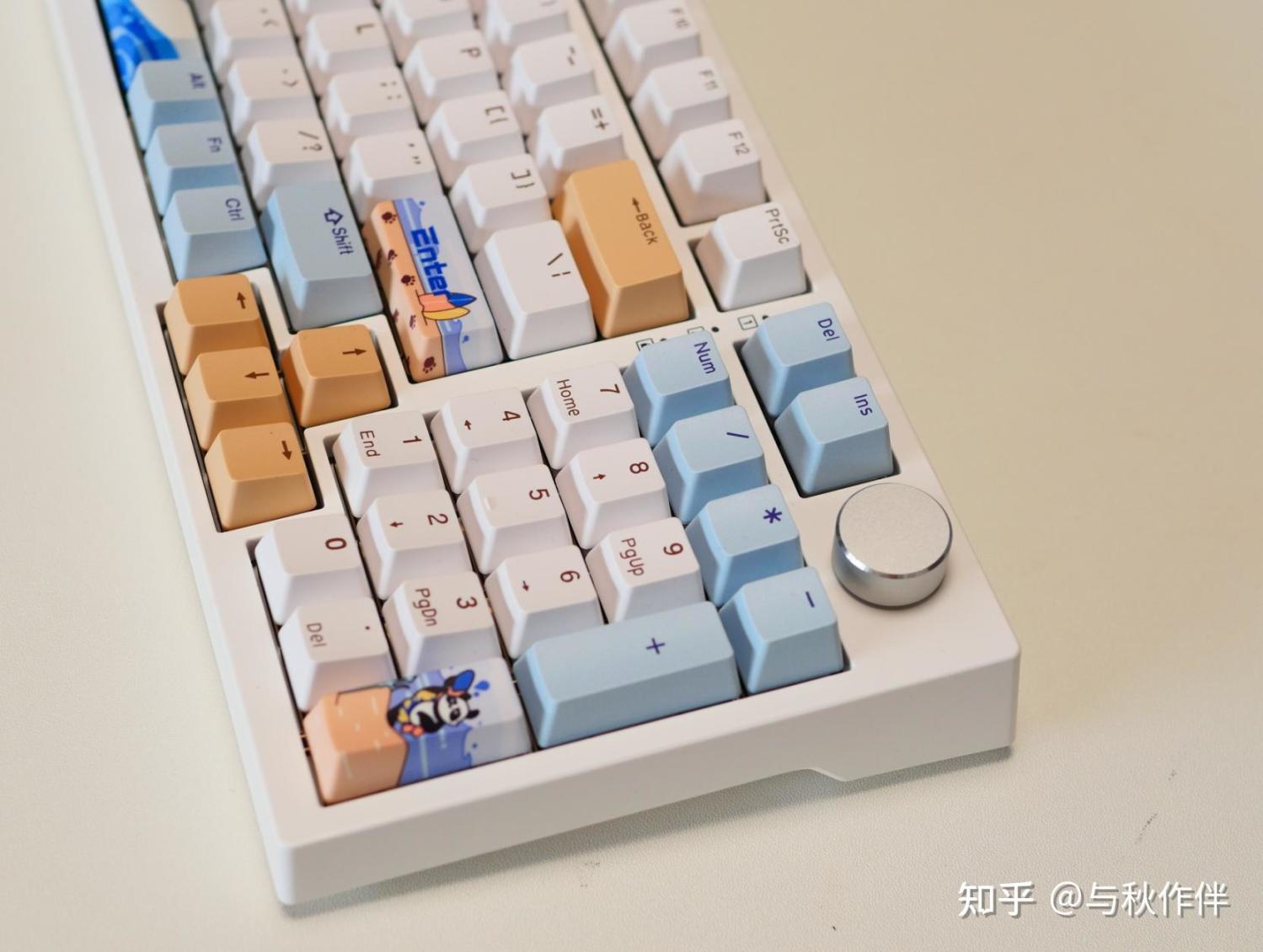这一版上加入了手感非常好的蛋白皮手托和右上角的旋钮、旋钮功能切换键,对比1代在整体使用感受上算是又有了一定的提升,尤其是这次配的PBT透光键帽,除了透光率高,也非常耐磨,不用担心键帽用久了打油了。