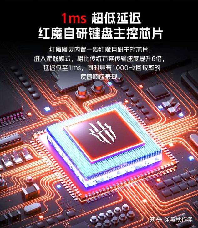 红魔魔灵是nubia旗下的红魔推出的一款主打游戏低延迟的机械键盘,最终呈现出的无线延迟达到了1ms以内,原因就是在于它的自研低延迟芯片。