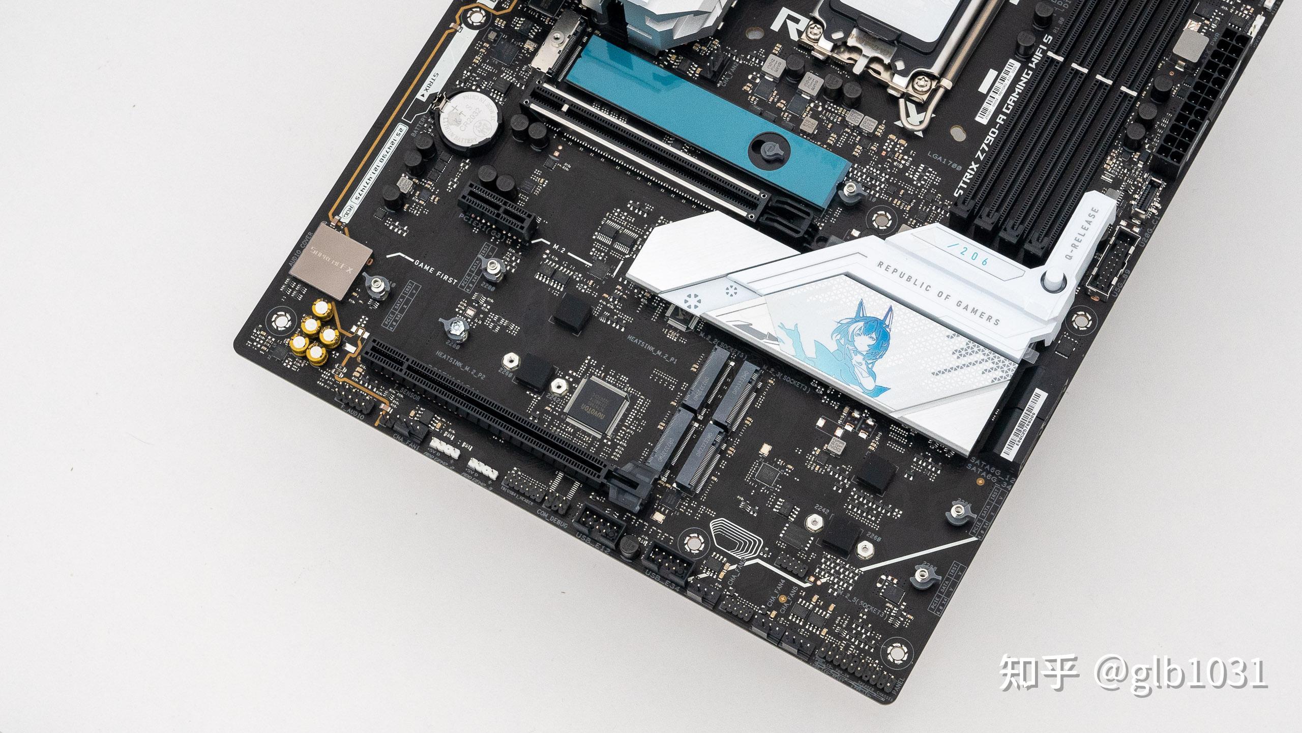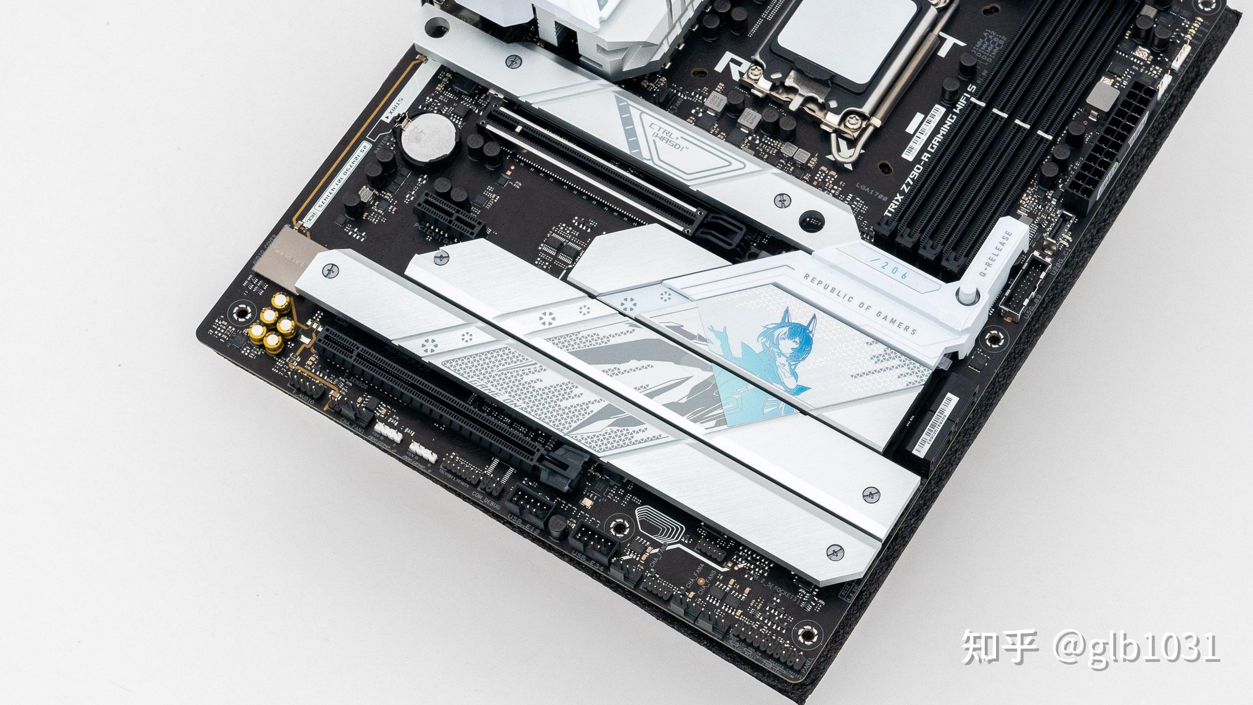 依舊是標準的ATX 版型,黑色PCB 搭配銀色/白色的散熱裝甲,I/O區域的敗家之眼LOGO 面積更大了,主板下半部的散熱裝機採用了更多二次元元素設計。
