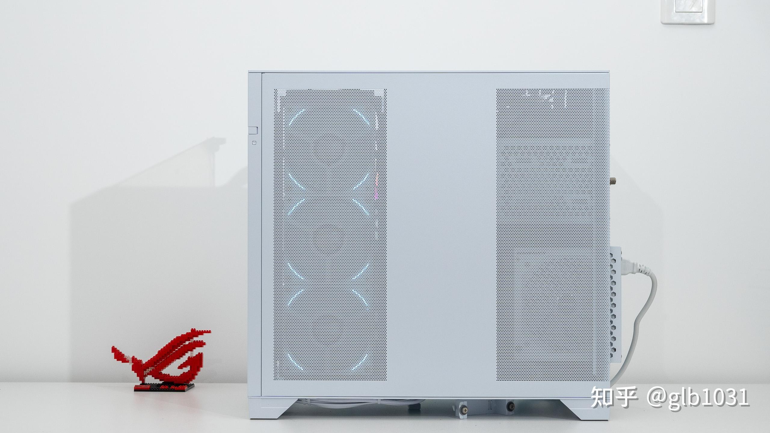 透過機箱背後的開孔還可以隱約看到內部利民CORE MATRIX 360 WHITE 幻芯矩陣一體式水冷自帶的TL-K12W 風扇的燈光效果若隱若現。