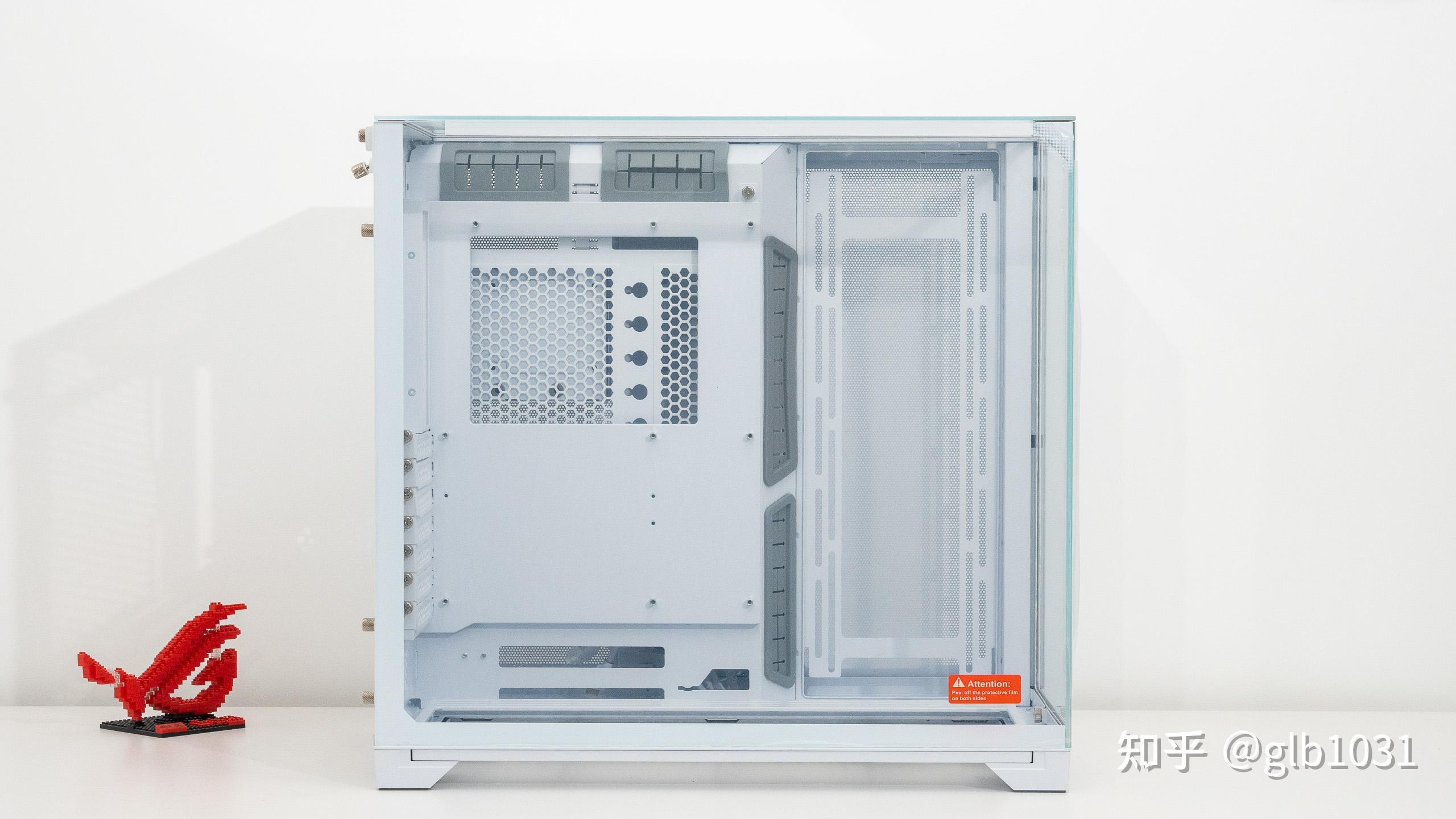 頂部視角還是要注意三面全玻璃機箱頂部CPU 供電與側面風扇電源線的走線理線問題的。因爲頂部沒有了遮擋,頂部CPU 供電線的理線不美觀也希望聯力後續有更新改善。