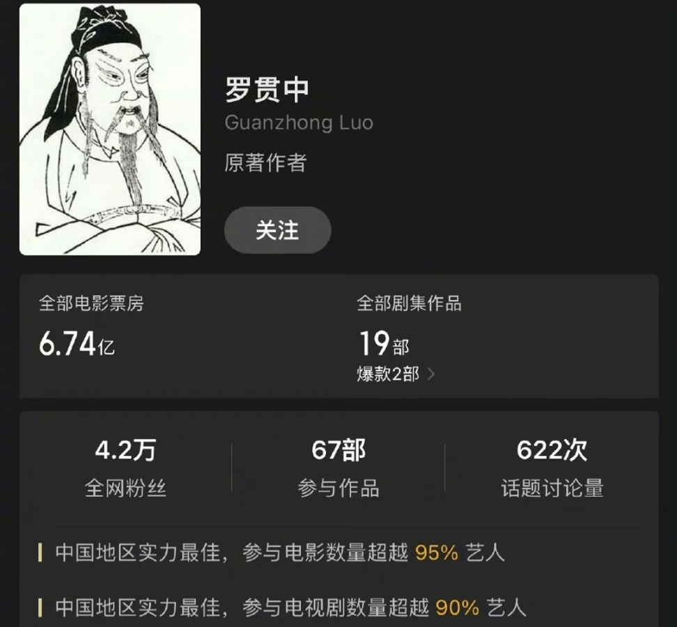可以看到,“吴承恩”在中国内地实力最佳,参与的电影数量和电视剧数量分别超过了98%和95%的艺人!