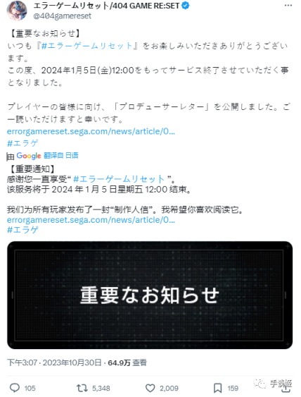 而就在遊戲上線半年後,10月30日的今天,官方宣佈將於明年1月5日停服。