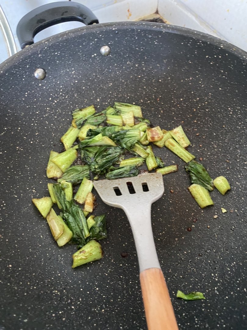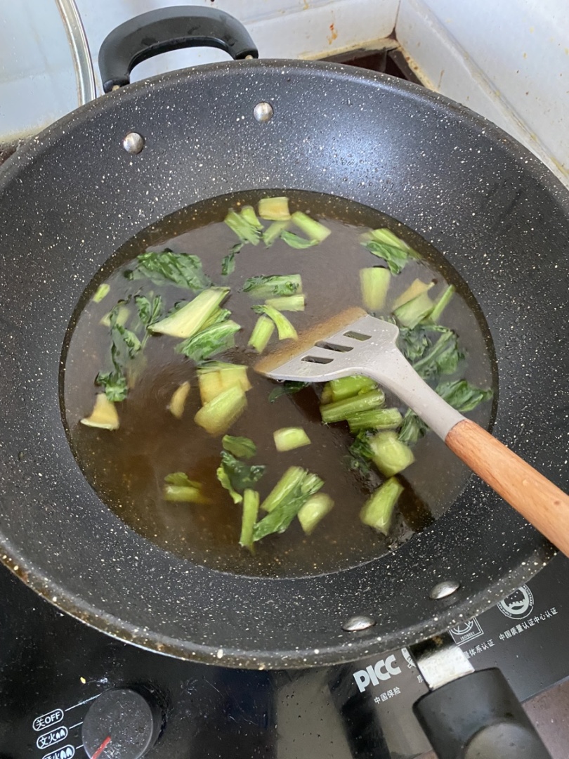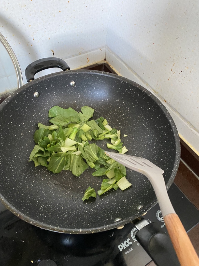 1.小青菜可切可不切,起锅烧油,倒入小青菜翻炒,加入蚝油,生抽,鸡精,盐,炒熟加水。