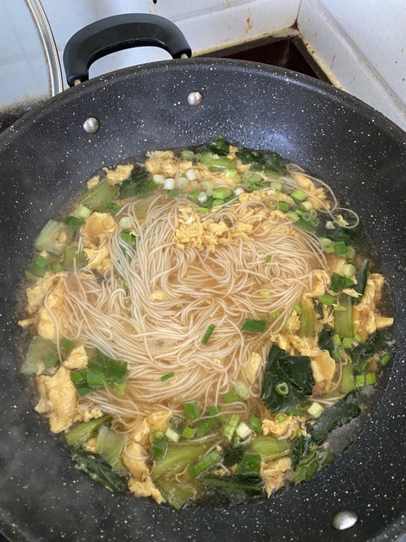 3.开水下面煮个7份熟,捞进汤锅里在煮一会,最后加入少许葱花