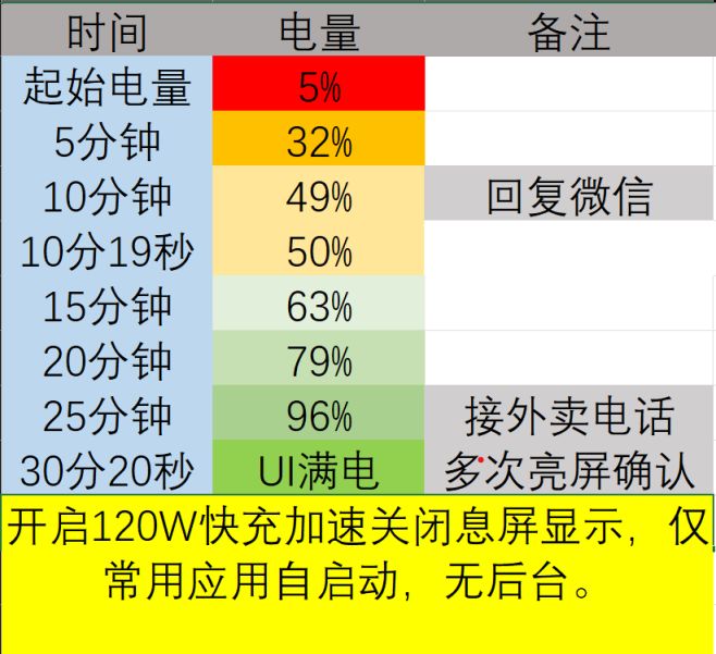 使用原装120W氮化镓和线材,开启快充加速,非“实验室环境”息屏充电时间如图。