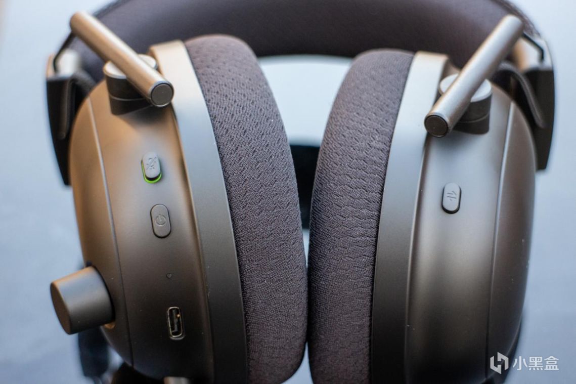 左侧外面为磨砂质感,中间刻入雷蛇LOGO,下边是音量调节的旋钮,底下是充电的C口和电源键以及突起的麦克风开关,右边就一个切换模式的按钮。