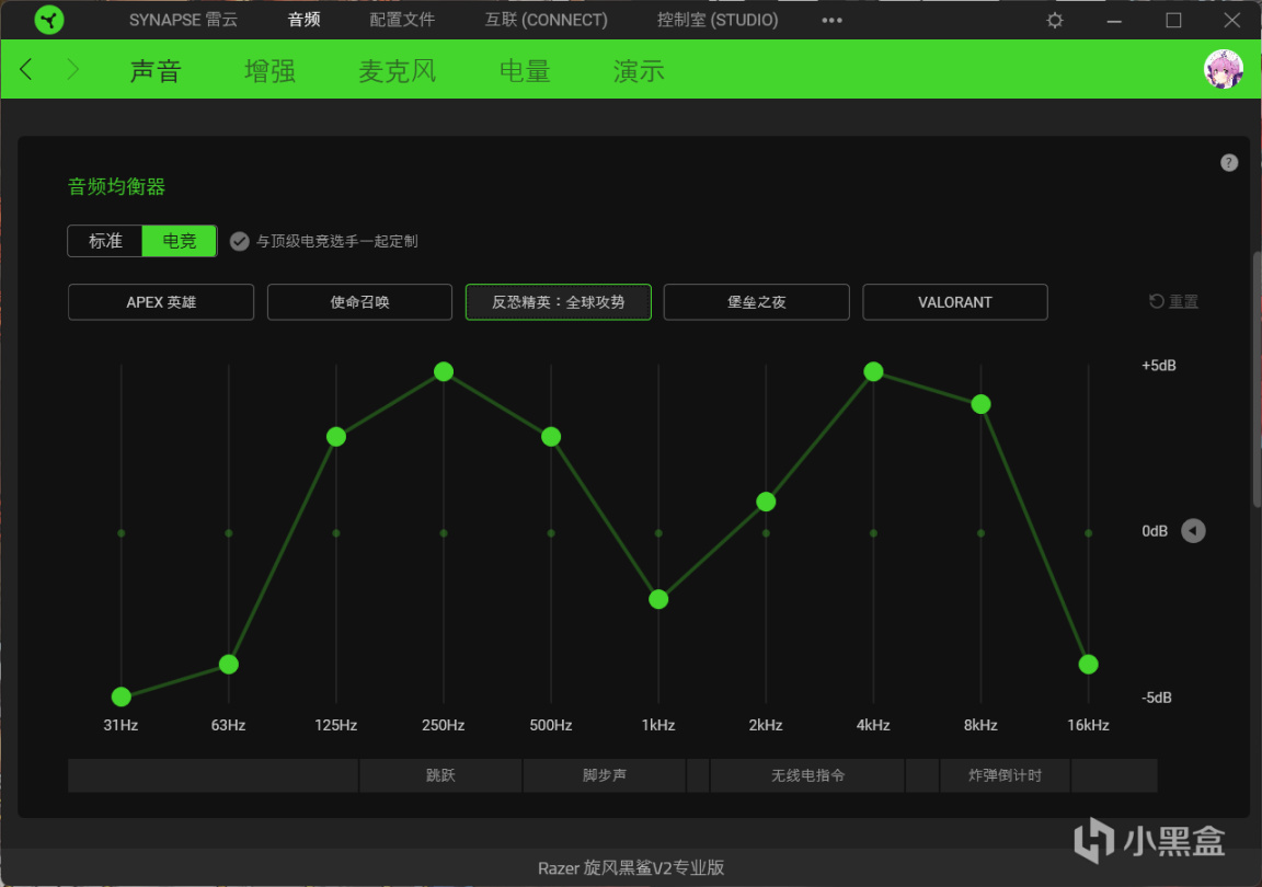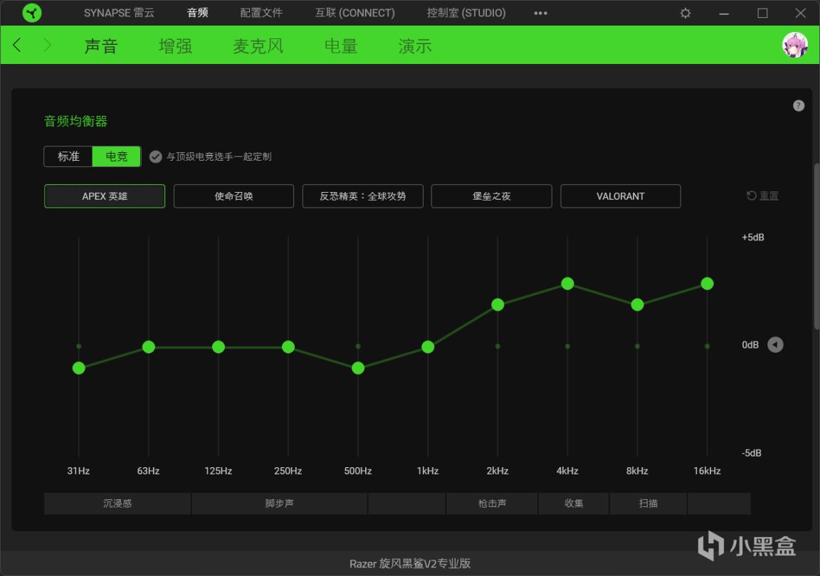在声音方面,旋风黑鲨鱼V2 Pro本身虽然是主打严肃电竞,但仍然有相当优秀的声音变现,基本功扎实。游戏之余听个歌看个电影也很好。如果你是懒人,我建议什么场景用其对应模式。雷蛇的调教很好了。一开始我以为是随便调的,别信就好,但是打脸挺疼的。如果听歌的话,强烈建议打开下面的THX音效,声场阔了不少。